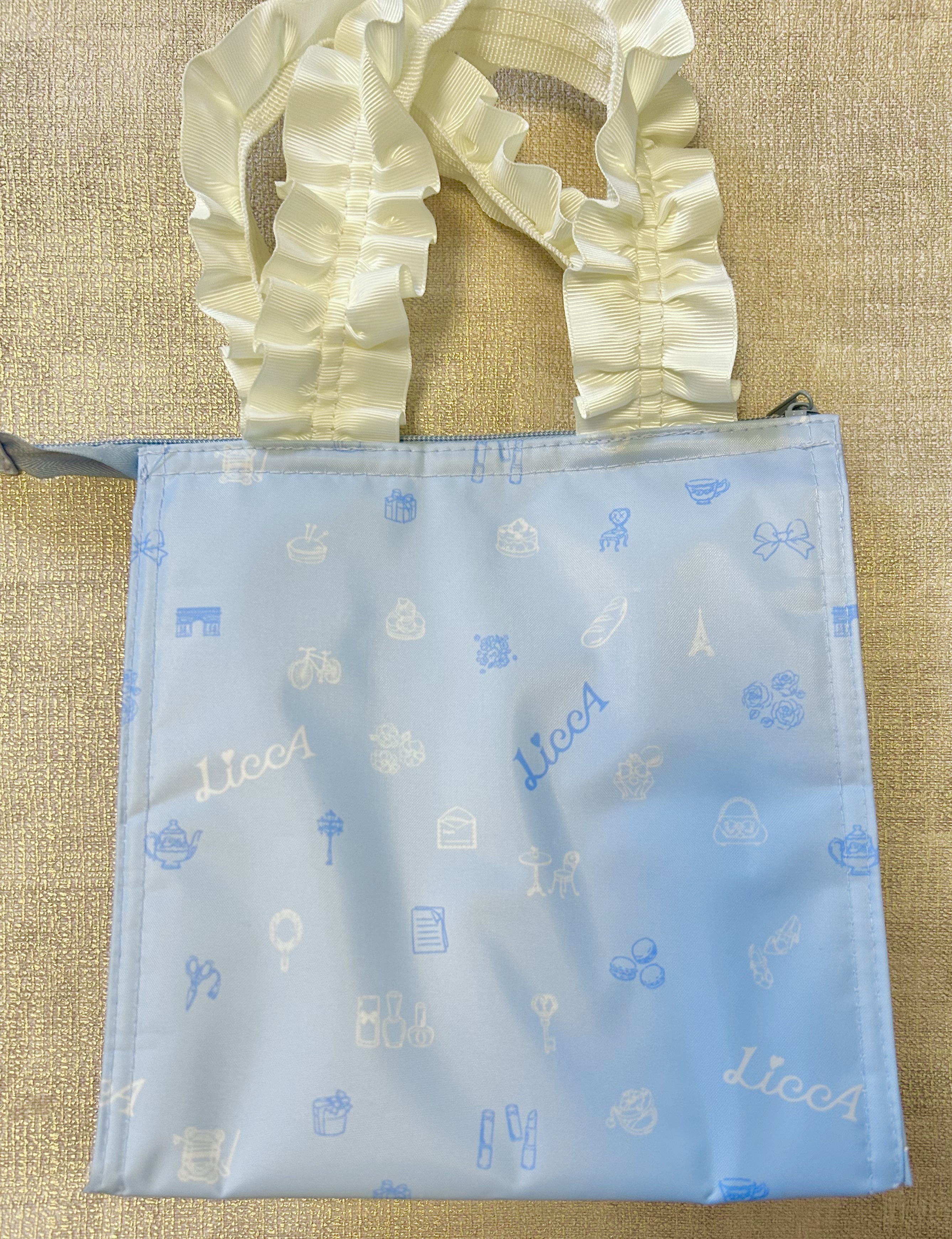 リカちゃんコラボの保冷バッグは、一見シンプルな模様に見えて、よく見るとマカロンやティーセット、エッフェル塔、凱旋門などフランスモチーフがちりばめられています。