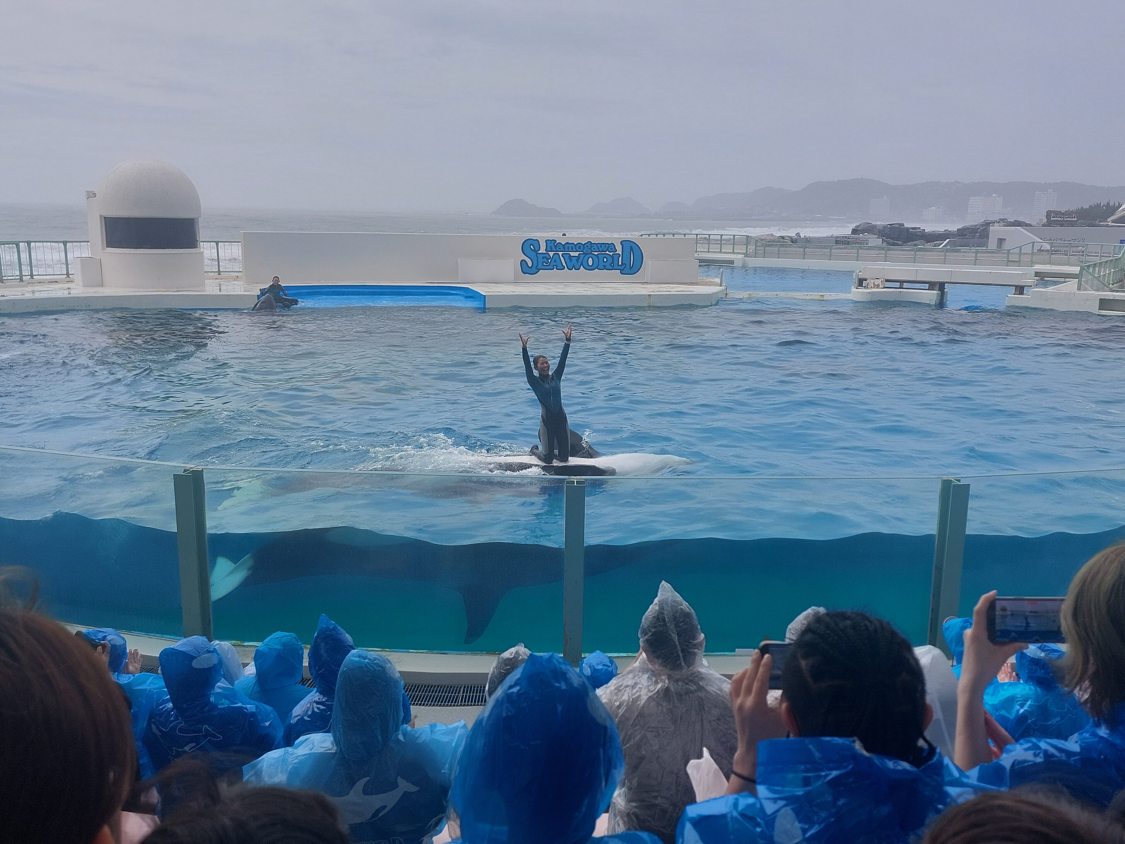 シャチショーが始まると巨体な体を持つシャチが華麗なジャンプをしてくれたり、逆さになって泳いだり、様々なパフォーマンスを見せてくれます。ジャンプの度にしぶきというより水の塊が容赦なく客席にふりかかります。