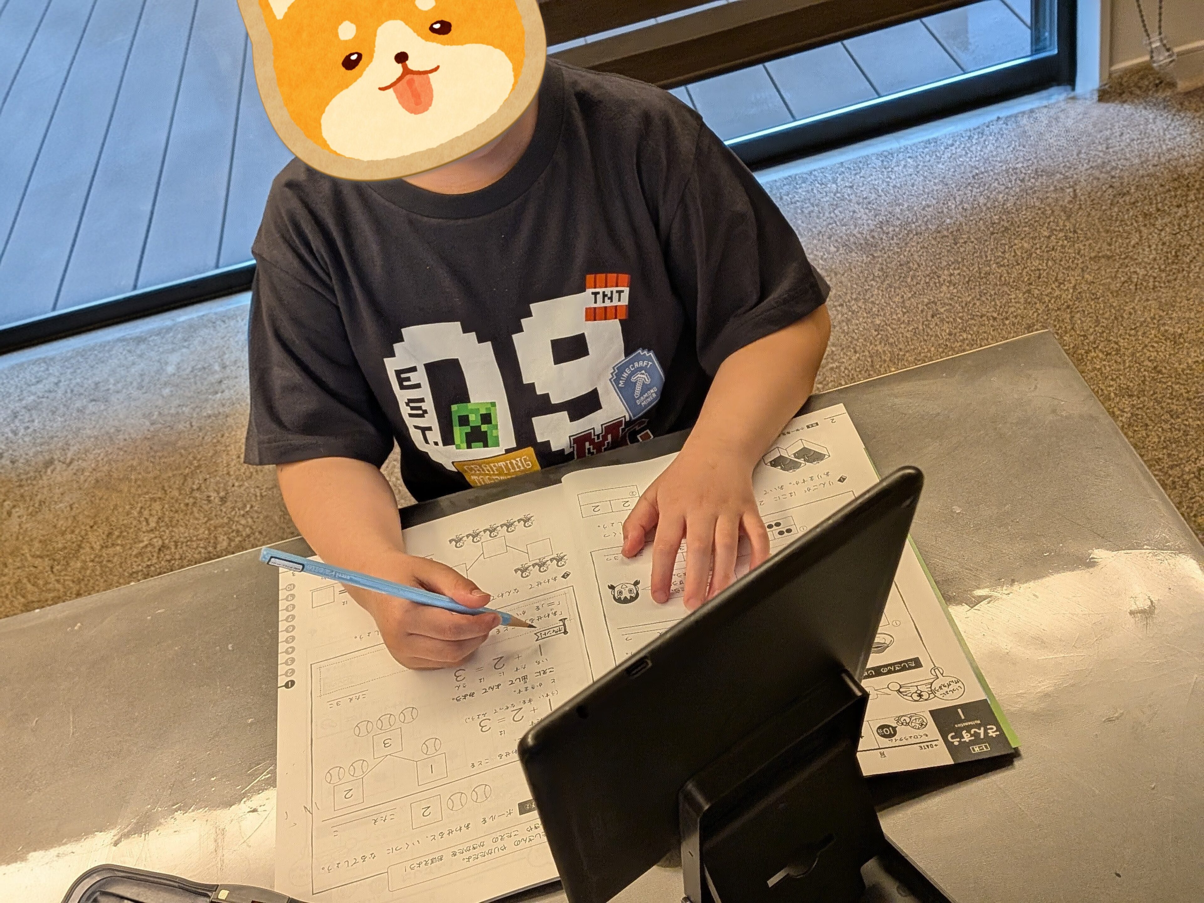 2人とも移動の手間がないからなのか、何回か声をかけても、ギリギリまでおやつを食べたりテレビを観ていたりしますが、オンライン学習の時間になると、しぶったりはせず机に向かってくれます。親としてはせめて5分前には着席していてほしいところですが、あまり欲張らずその都度声をかけて習慣化できるように努めていきたいと思っています。