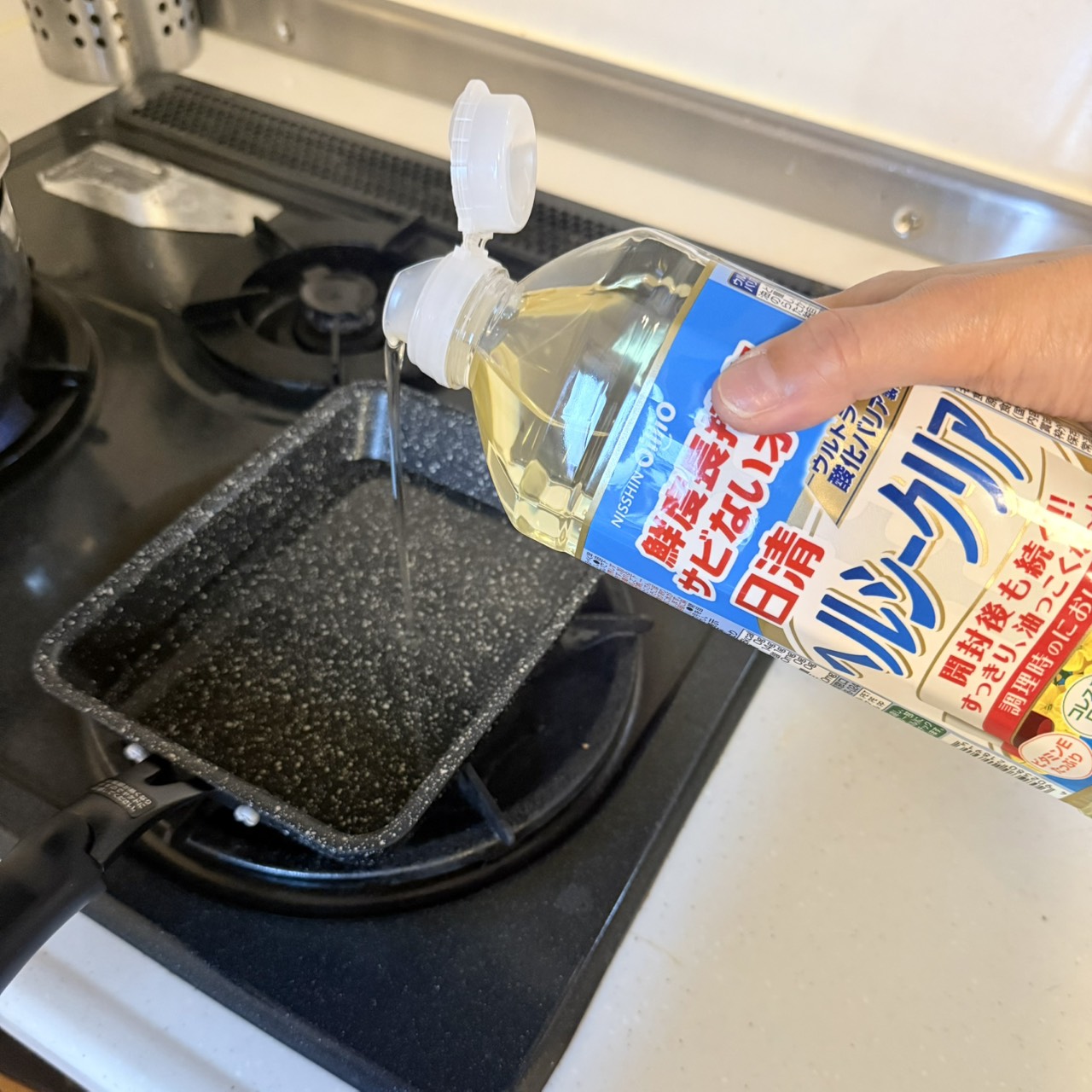 揚げ油は、最近では日清オイリオの「日清ヘルシークリア」を使っています。
