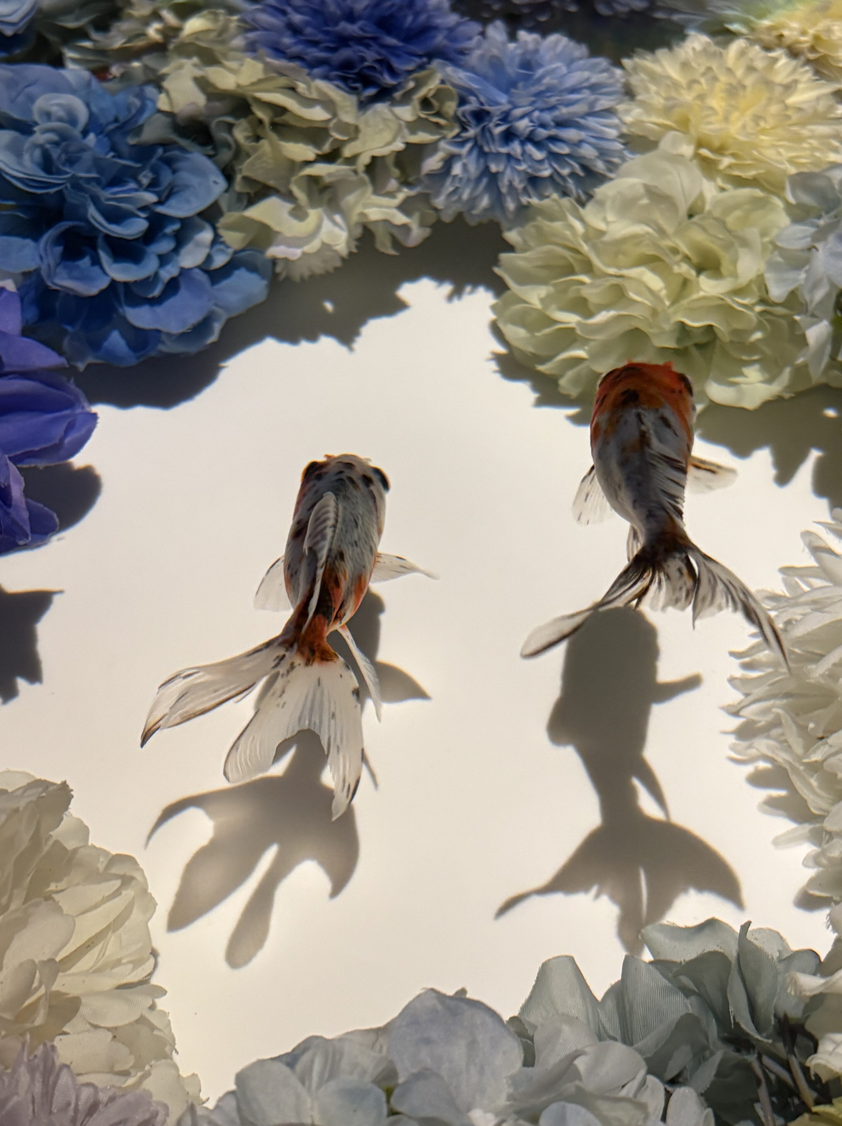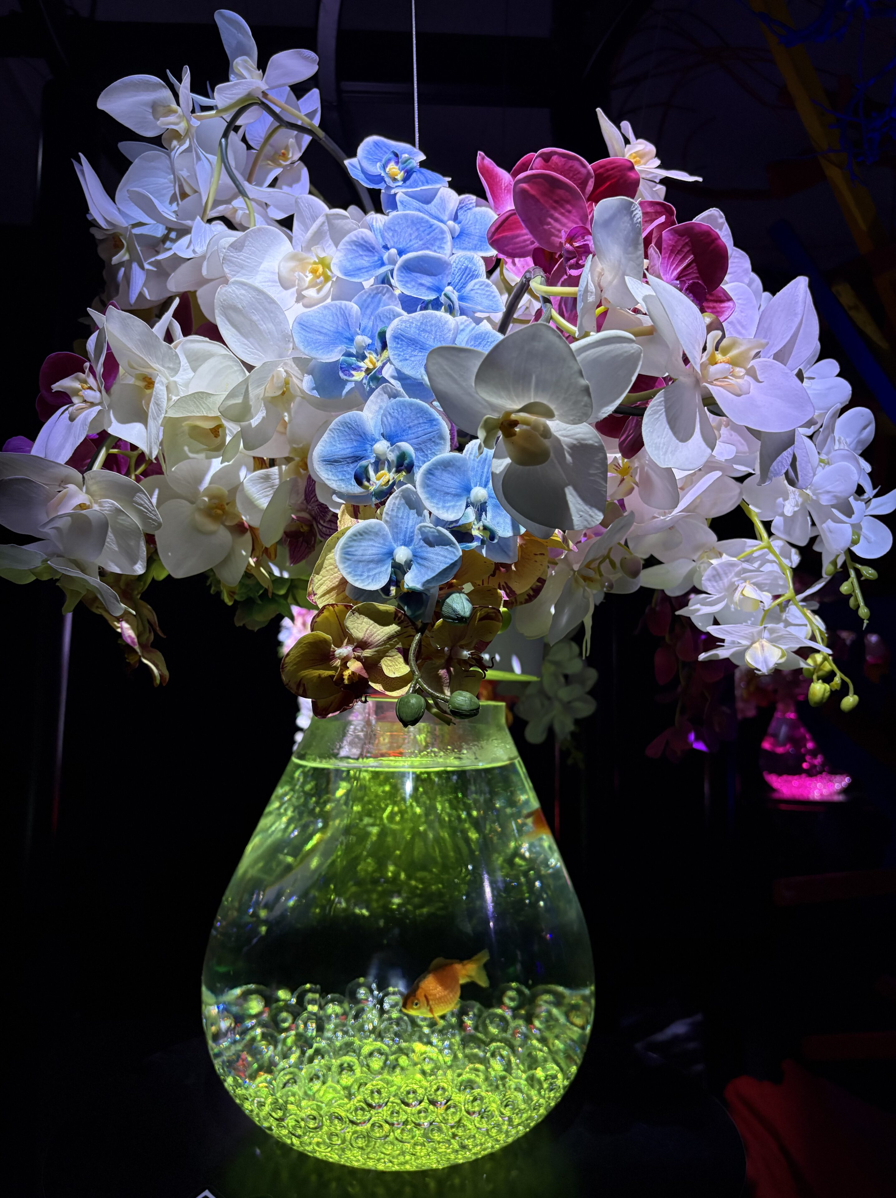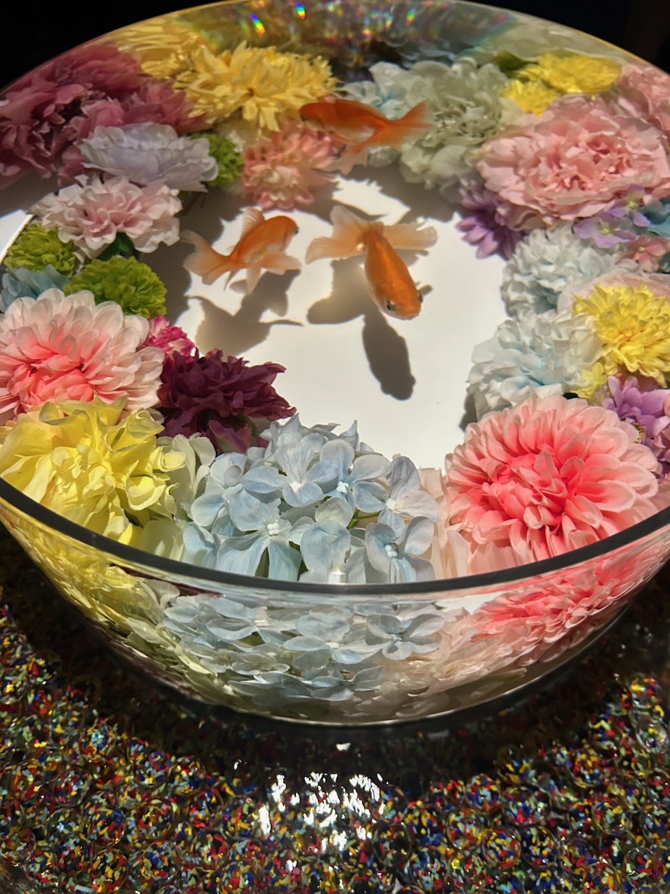 たくさんの胡蝶蘭とゆらゆらと舞う金魚、色彩鮮やかで思わず見とれてしまいます。