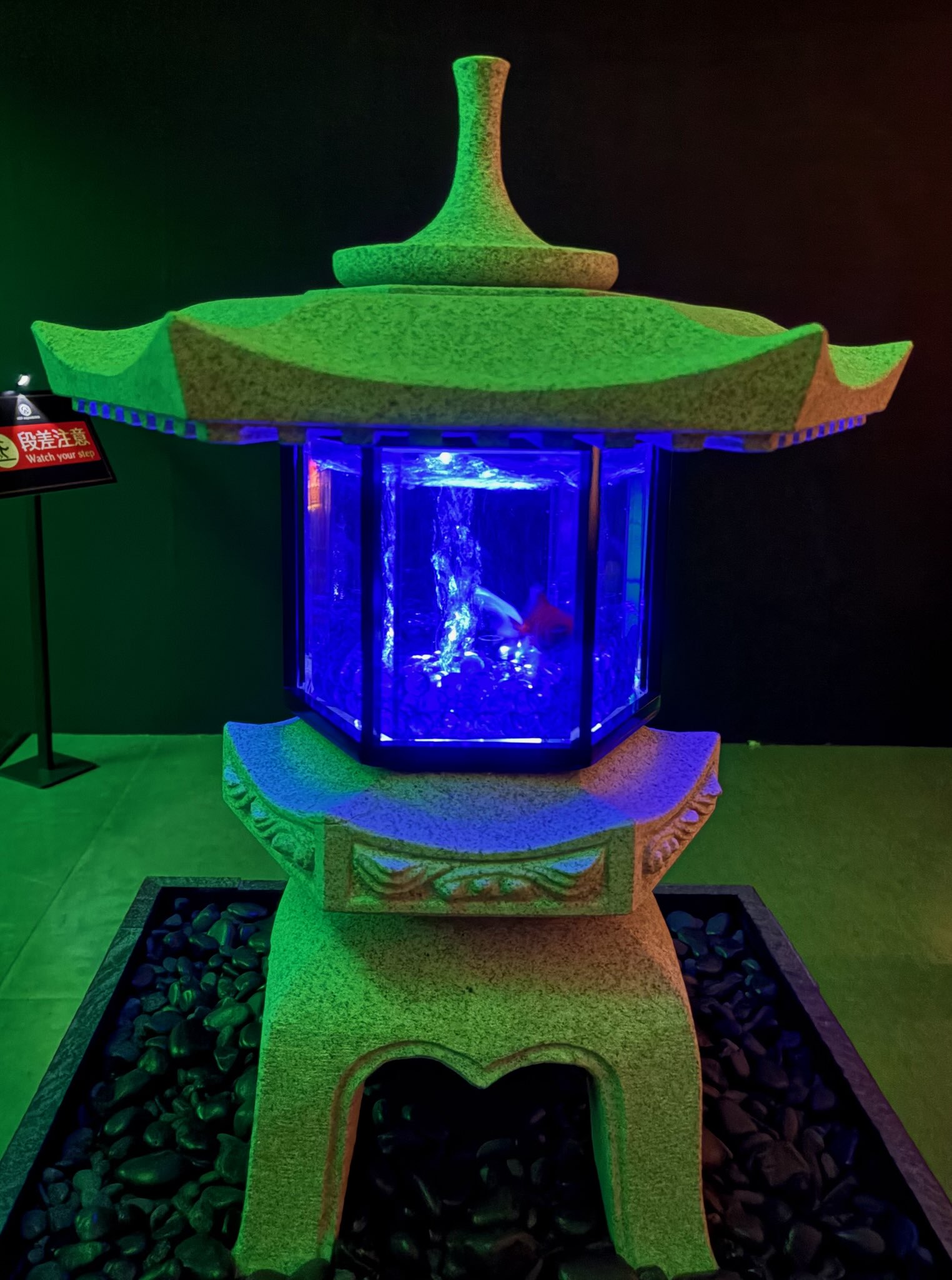 神社仏閣に灯りをともす石灯籠がモチーフ。灯籠の火袋部分が水槽となり、金魚が泳ぐと灯火のように見えます!