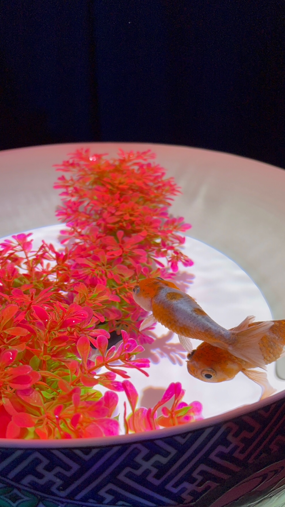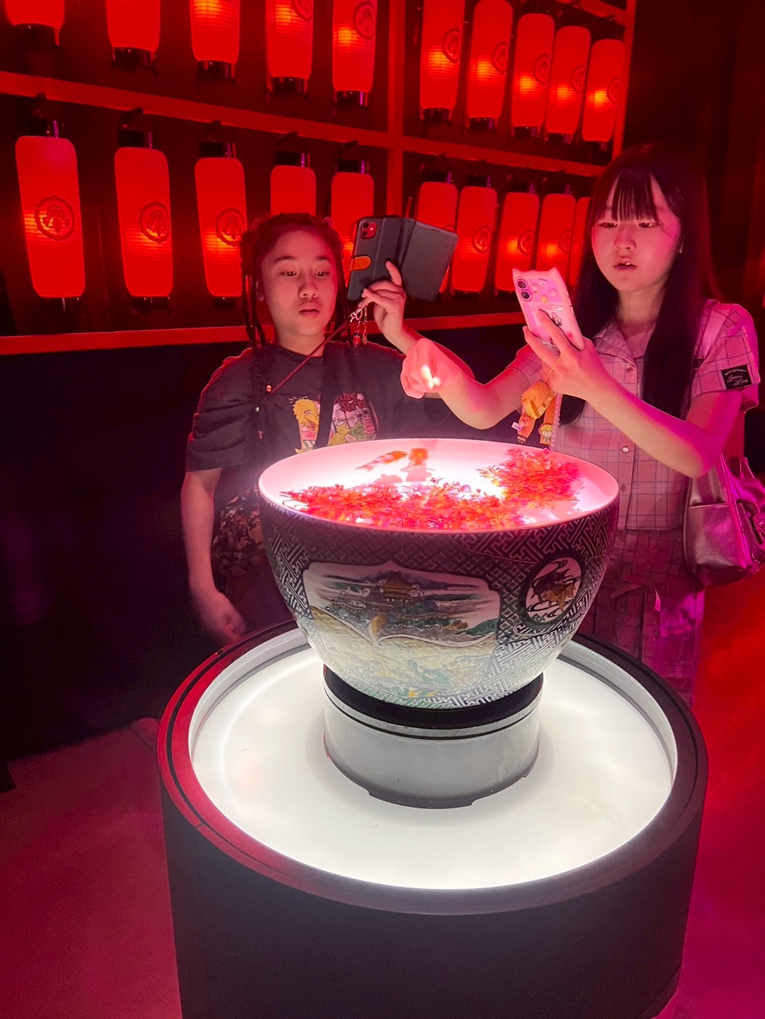 鮮やかな色彩と華やかな絵付けの陶器の中を金魚が泳ぎます。