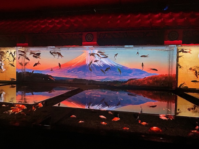 絵巻をモチーフにした新作。背景に日本の四季を映し出し、その中を金魚が優雅に泳ぎます。