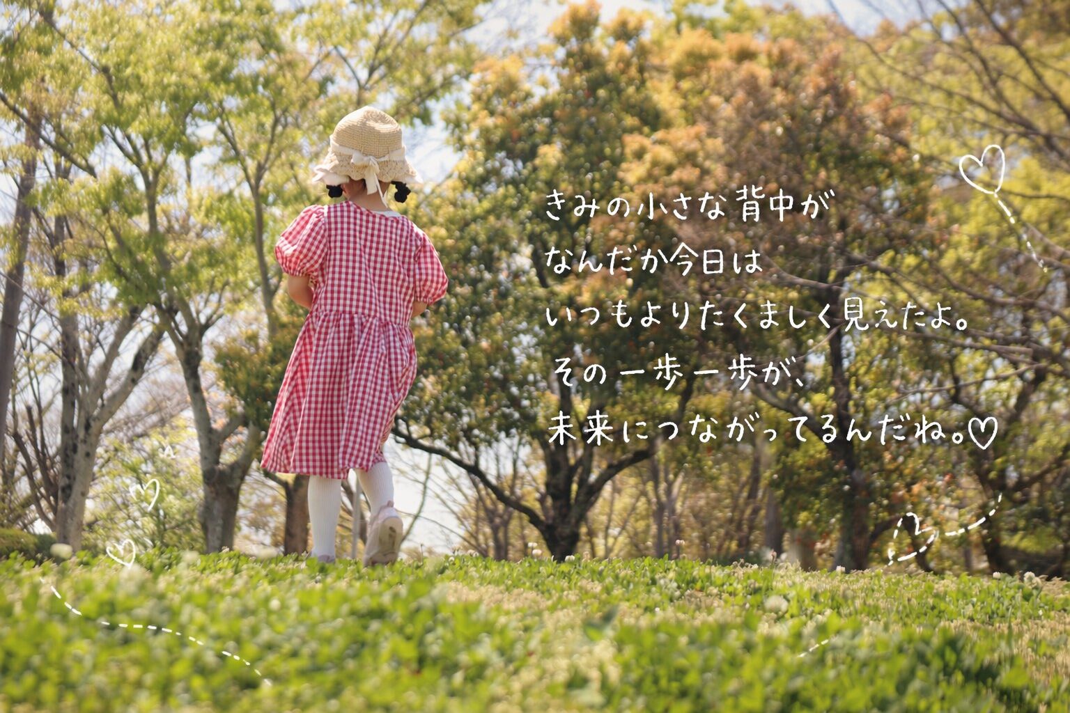 この写真は、先日公園に遊びに行ったときに、シロツメクサやモンシロチョウを探して、草原を走り回る娘。