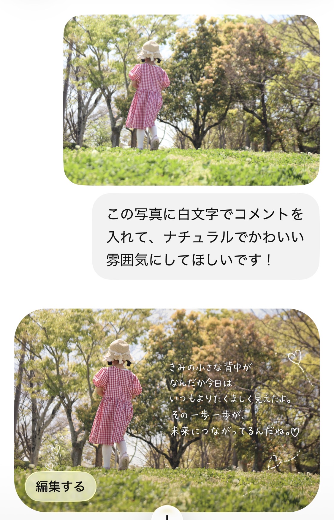 「この写真に白文字でコメントを入れて、ナチュラルでかわいい雰囲気にしてください。」