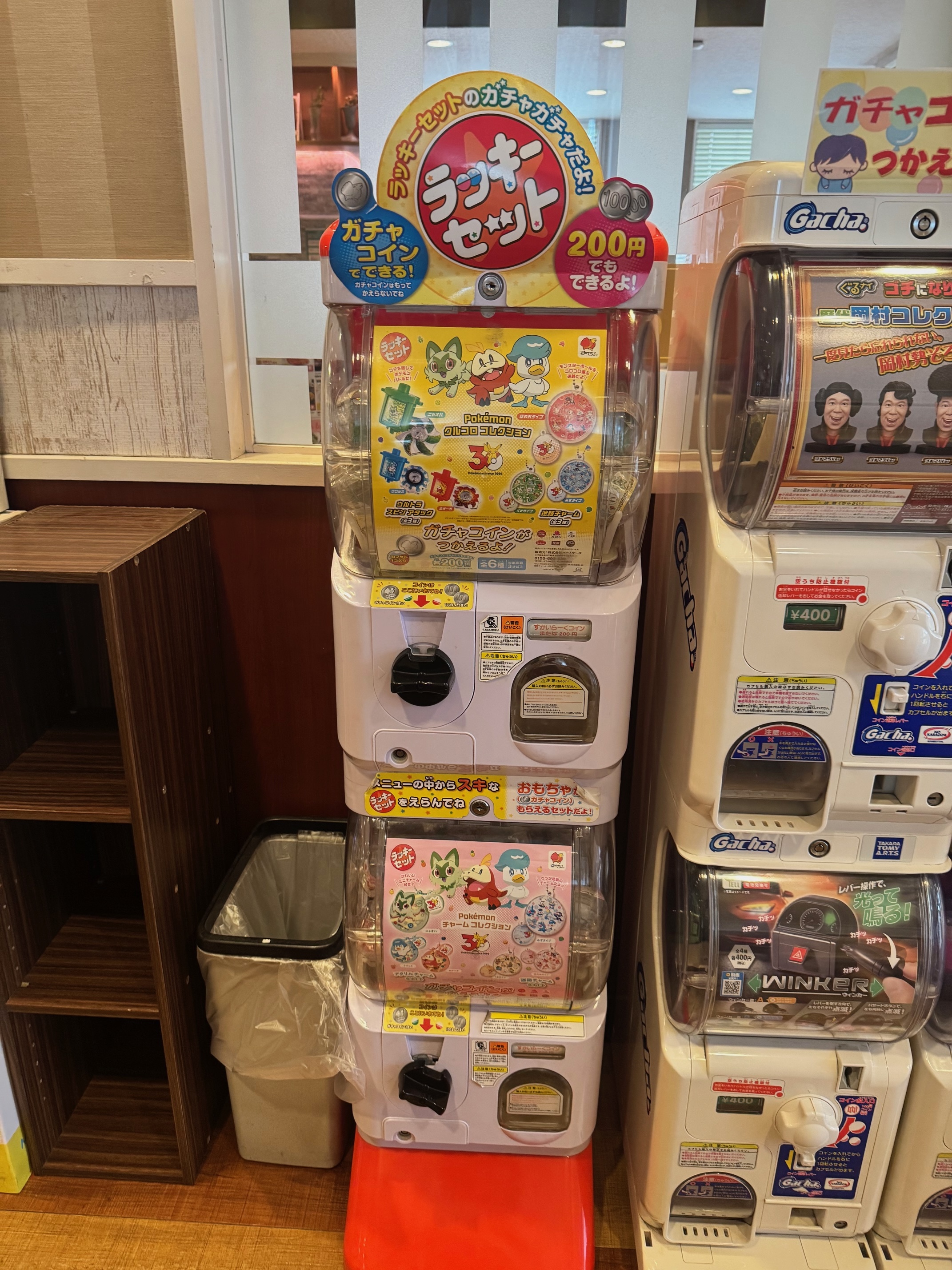 小学生以下限定の「ラッキーセット」メニューのカプセルグッズにもポケモンが登場しています。対象メニューの注文でガチャコインがもらえて、「チャーム コレクション」 か 「クルコロ コレクション」のどちらかのガチャマシンを選んで回すことができます。