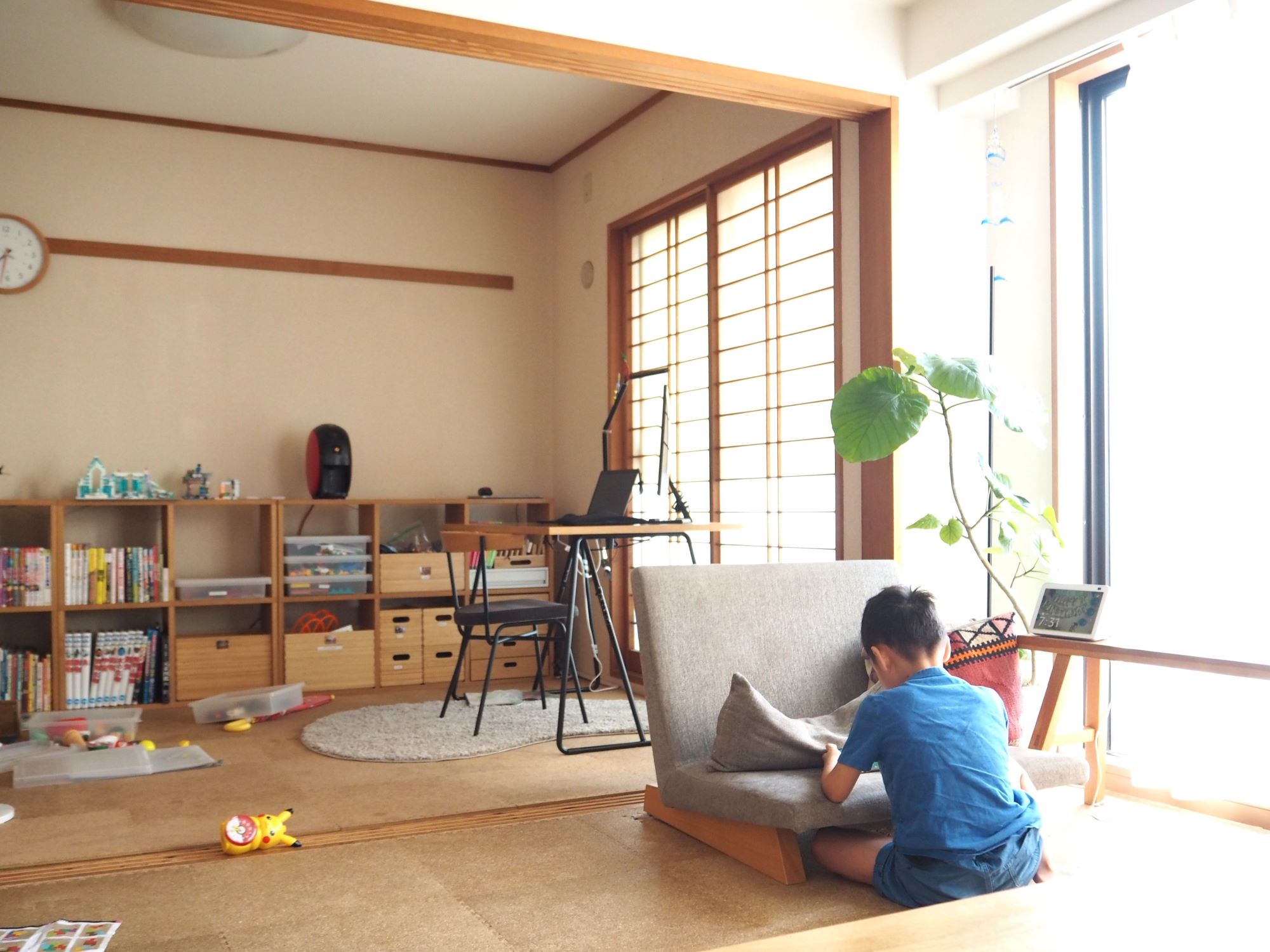 2LDK暮らしのため、親子とも個室はありませんが、ちょっとひとりになれる場所も必要だと思っています。そこでリビングの奥に作業机を設置しました。ふすまを閉めれば個室になります。勉強や読書に集中したいとき、家族交代で使っています。子どもが小学生のうちは、こうした共有スペースがあれば十分かなと思っています。