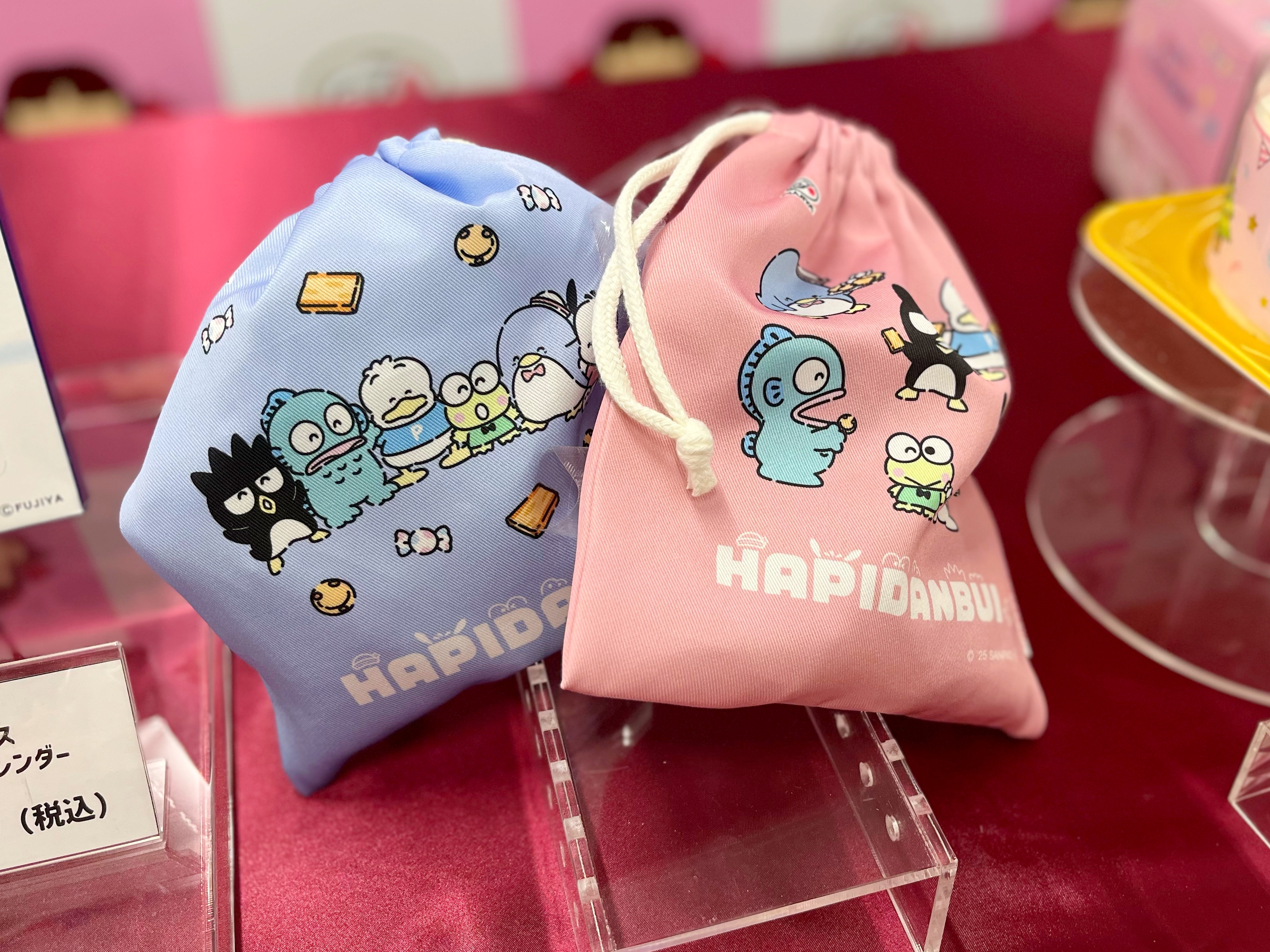 「はぴだんぶい」とコラボした特別なデザインのお菓子入り巾着も発売されます。キャラクターたちが不二家のお菓子を手に持ったデザインは可愛らしさ満載。「はぴだんぶい」のダイカットステッカー(全6種)がランダムで1枚封入されています。どのキャラクターが出るかはお楽しみに!