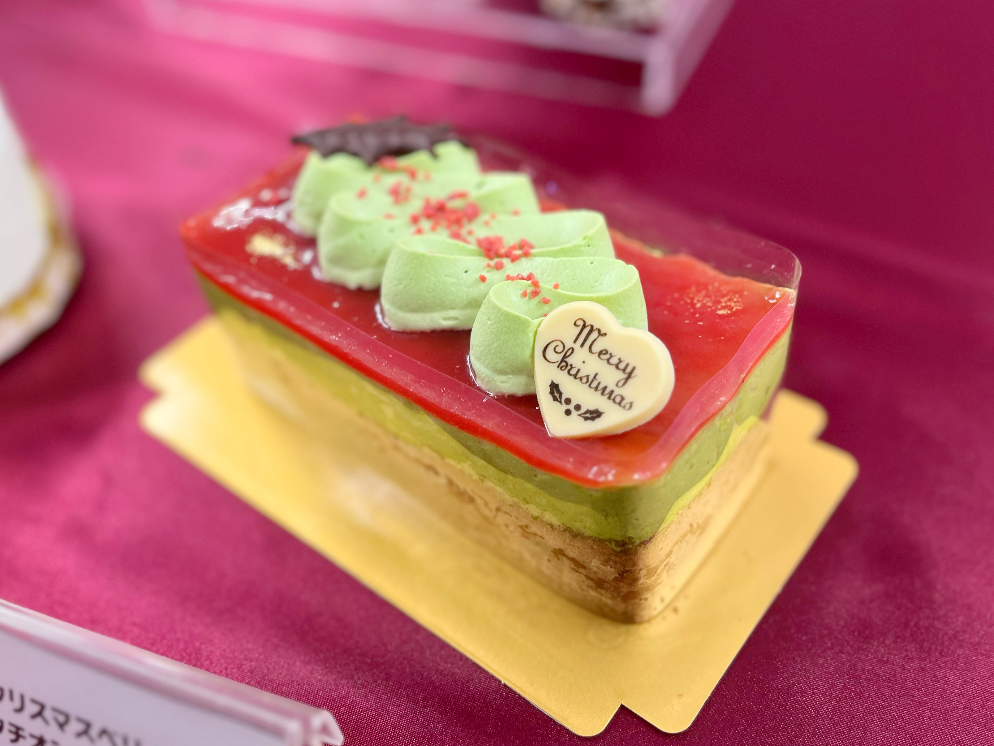 ココアスポンジにサクサク食感のフィアンティーヌ、ピスタチオとチョコムースを重ね、上面は甘酸っぱいベリーソースとピスタチオクリームで仕上げました。赤と緑の鮮やかなクリスマスカラーが、おうち時間を華やかに彩ってくれます。