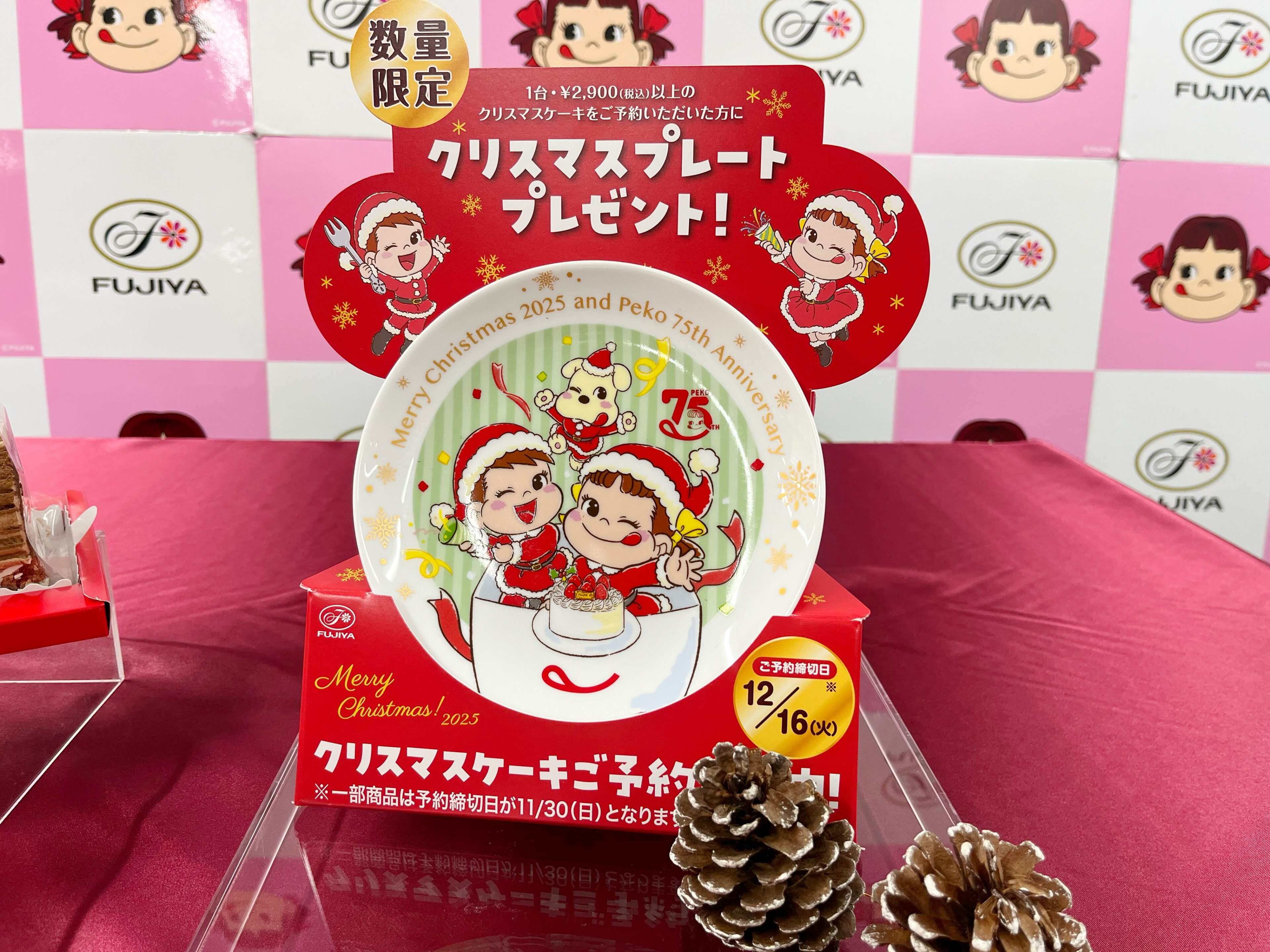 毎年恒例のクリスマスケーキ予約特典として、今年もクリスマスプレートが用意されています。クリスマスケーキの予約期間である10月1日(水)~12月16日(火)の期間内に、1台税込 2900円以上のクリスマスケーキを予約すると、「2025年クリスマスプレート」(直径160mm)がもれなくもらえますよ。今年はペコちゃん、ポコちゃん、ドッグが皆様のおうちにサプライズでお祝いする様子を描いた限定のデザインで、生誕75周年を迎えたペコちゃんの75周年ロゴ入りです。