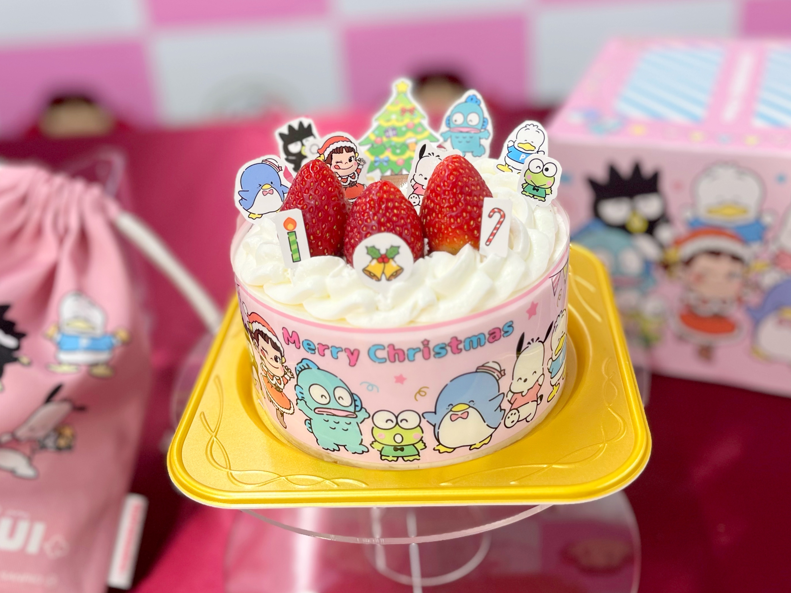 株式会社サンリオの個性あふれる男の子キャラクターユニット「はぴだんぶい」とのコラボケーキです。まろやかな練乳入りシャンテリークリームとリンゴ・黄桃のシロップ漬けをスポンジでサンドした、やさしい味わいのショートケーキの上には、「はぴだんぶい」とペコちゃんがクリスマスパーティ楽しむようすが描かれています。