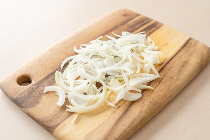 1.かぼちゃは1.5cm角に切る。電子レンジ600Wで3分加熱する。玉ねぎは薄切りにする