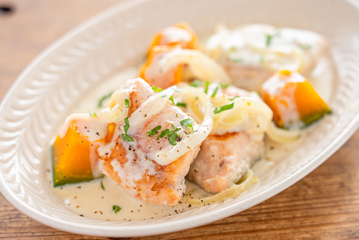 秋を感じるひと皿「鮭とかぼちゃのミルク煮」ぐっち夫婦の取り分けレシピ
