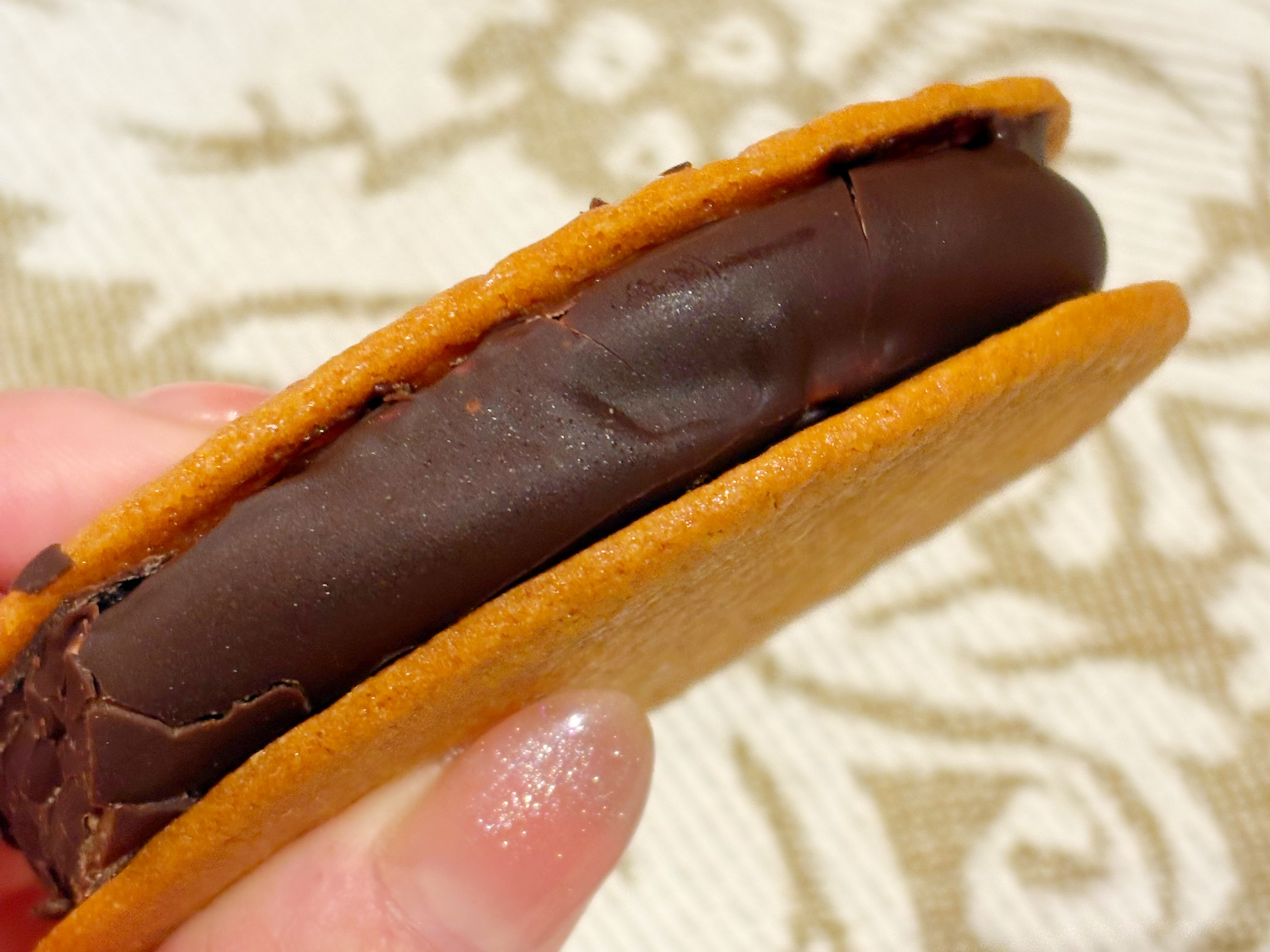 パリッと食感のチョココーティング・なめらかなチョコクリーム・ほんのりビターなチョコソースの3つを楽しめるスイーツ。パリッと食感のチョココーティングが新しい!一口かじると、ほんのりビターな味わいのチョコクリームが溢れます。サクッとしたビスケットで挟みました。