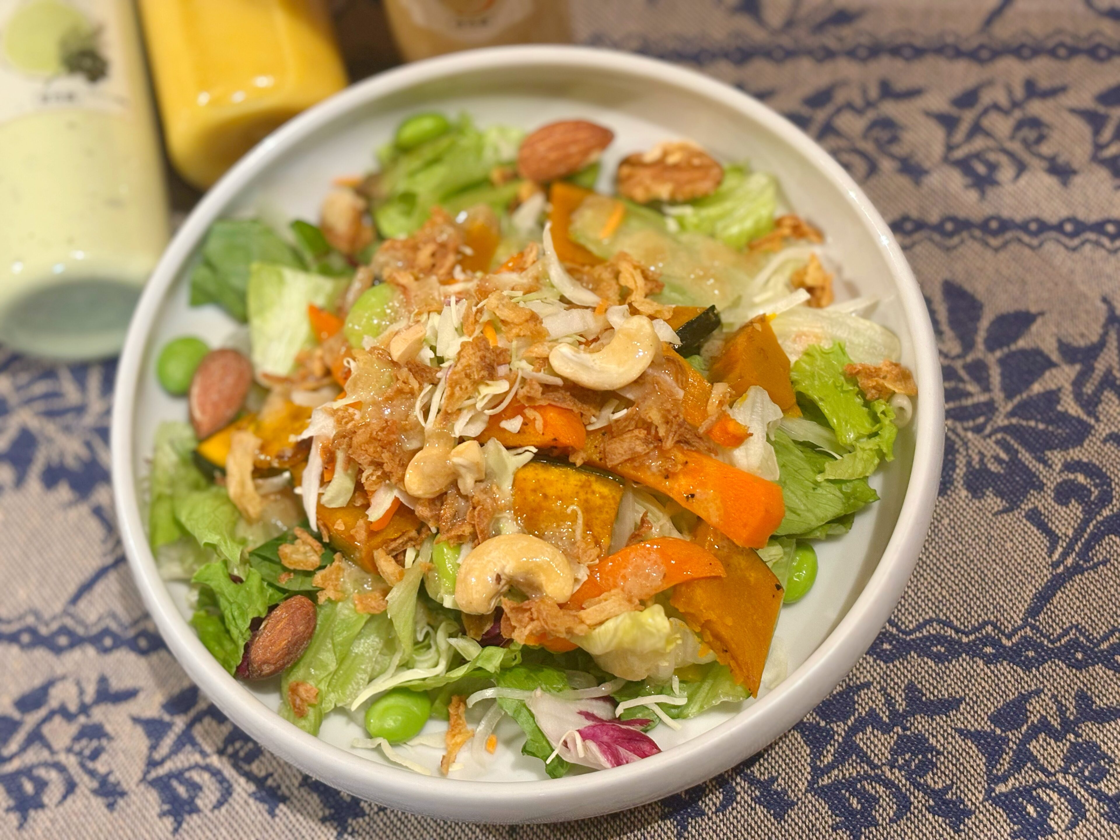 ローストした野菜や、ナッツなど家にあるものをなんでものせて、お好きなドレッシングをたっぷりと。これでだけでいつもとはちょっと違うよそゆきの味わいになりますよ。