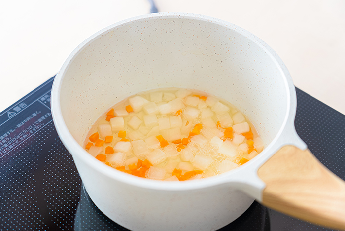 2.小鍋にだし汁、かぶ、にんじんを入れて、15分ほど中火にかけて煮る(お好みでしょうゆを少量入れてもOK)