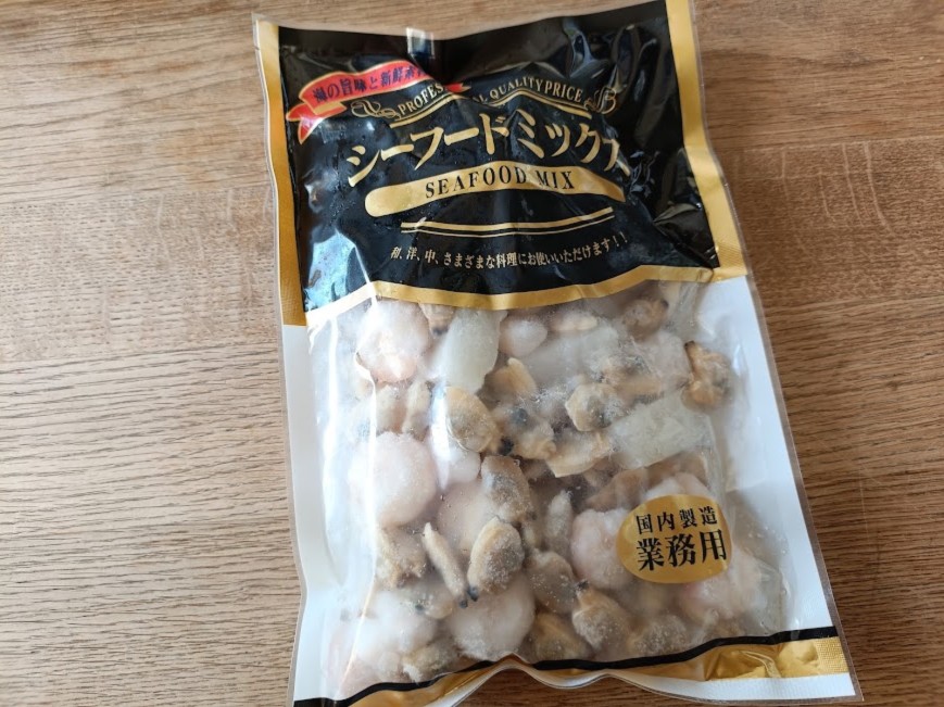 えび(インドまたはパキスタン)、ボイルあさり(中国)、いか(中国またはペルー)のシーフードミックスです。クリスマスのパエリア用に購入。別のお店で購入したパエリアの素を使って炊飯器で炊くので、超簡単にクリスマス用の特別メニューが作れます。