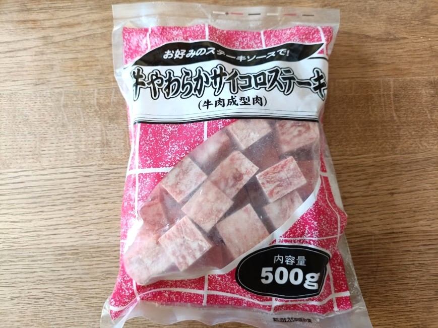 クリスマスのサイコロステーキ用に購入。お好みの味付けで楽しめます。わが家では醤油ベースのステーキソースに、ニンニクとブラックペッパーを効かせるのが人気です。オーストラリア産の牛肉を使用した牛肉成型肉。100g当たり、285Kcal。