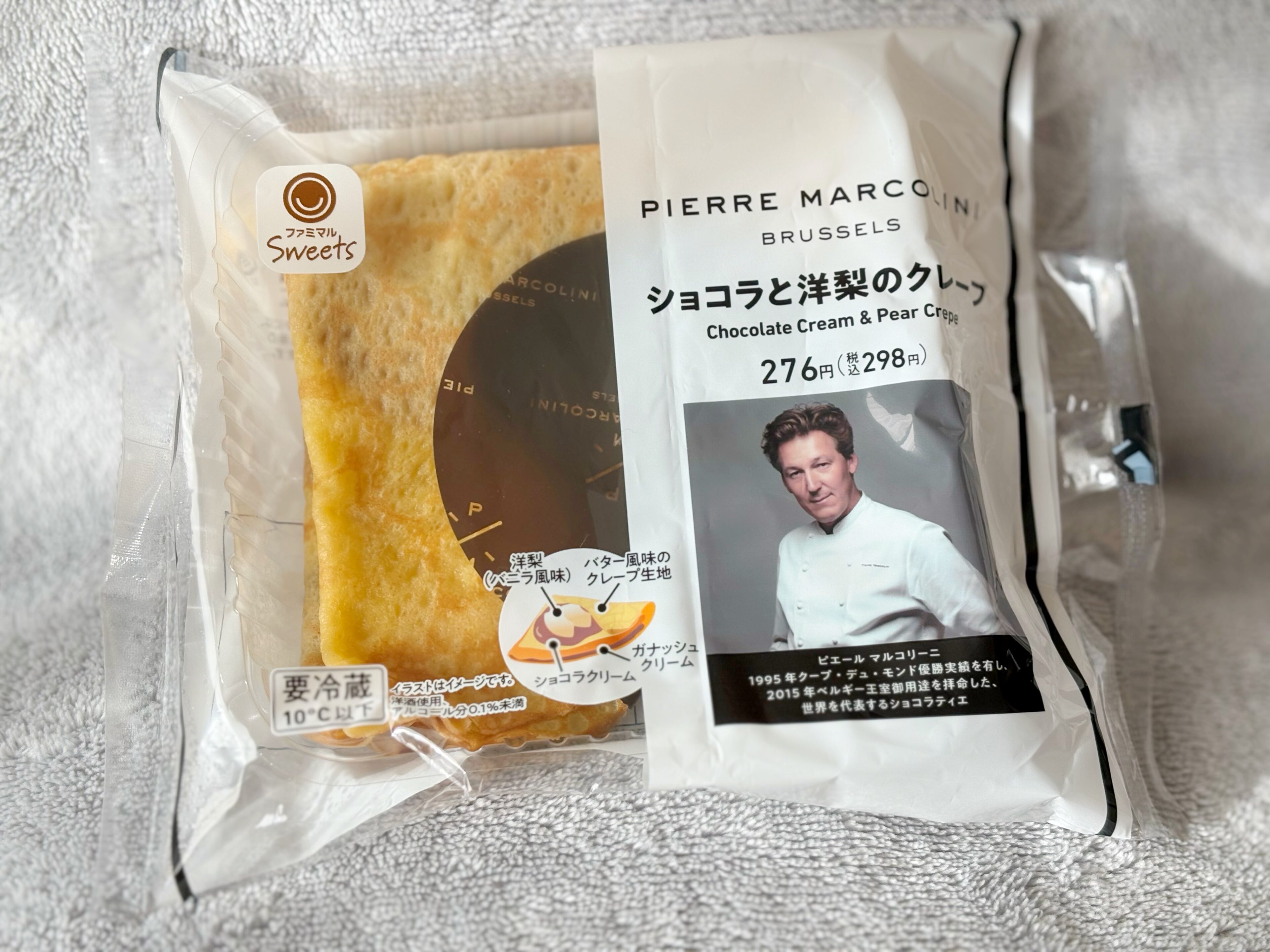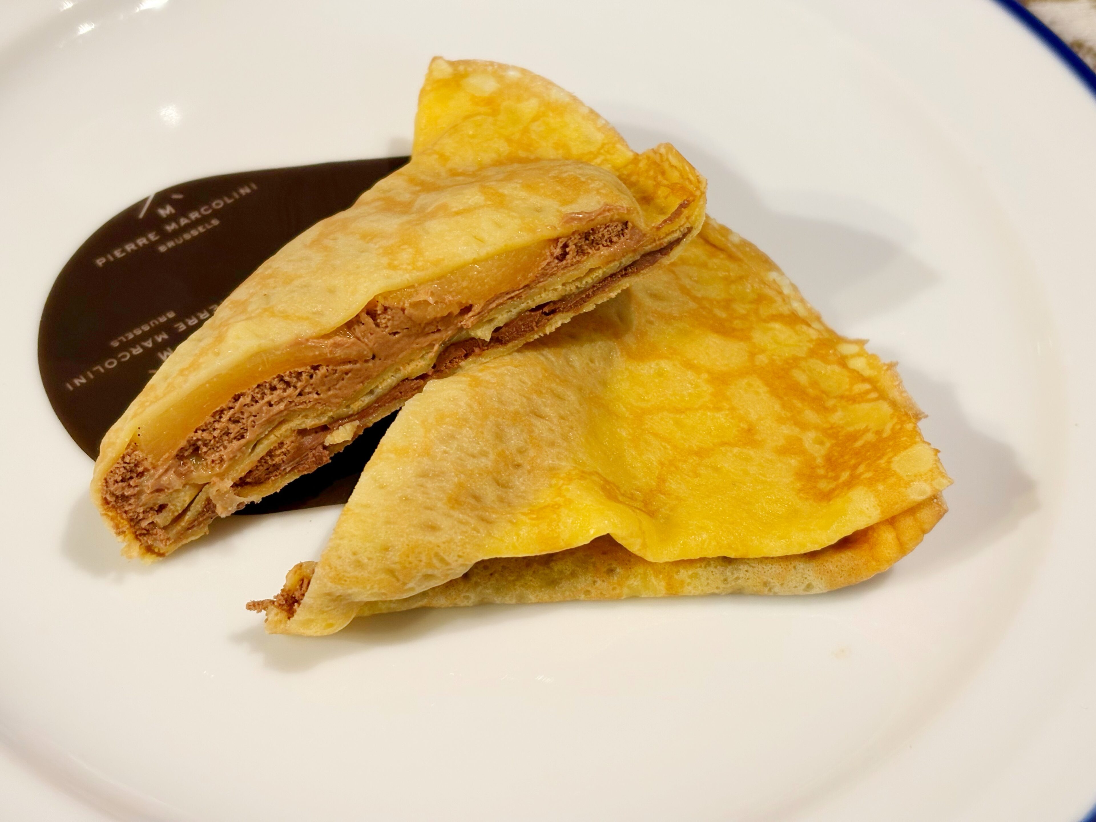 濃厚なショコラクリームと、ショコラを引き立てるバニラで香り付けした洋梨をクレープで包んでいる。
