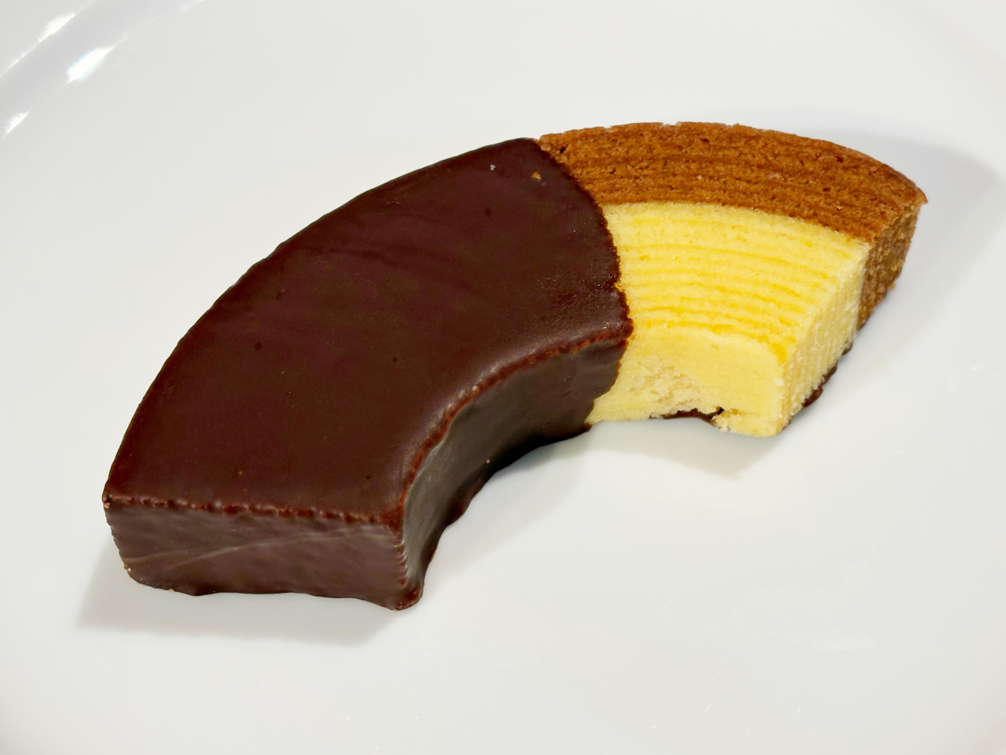ショコラ味の生地と発酵バター香るプレーン生地、しっとりとした2層のバウムクーヘンに、チョコをかけ、パリッとした食感をプラス。