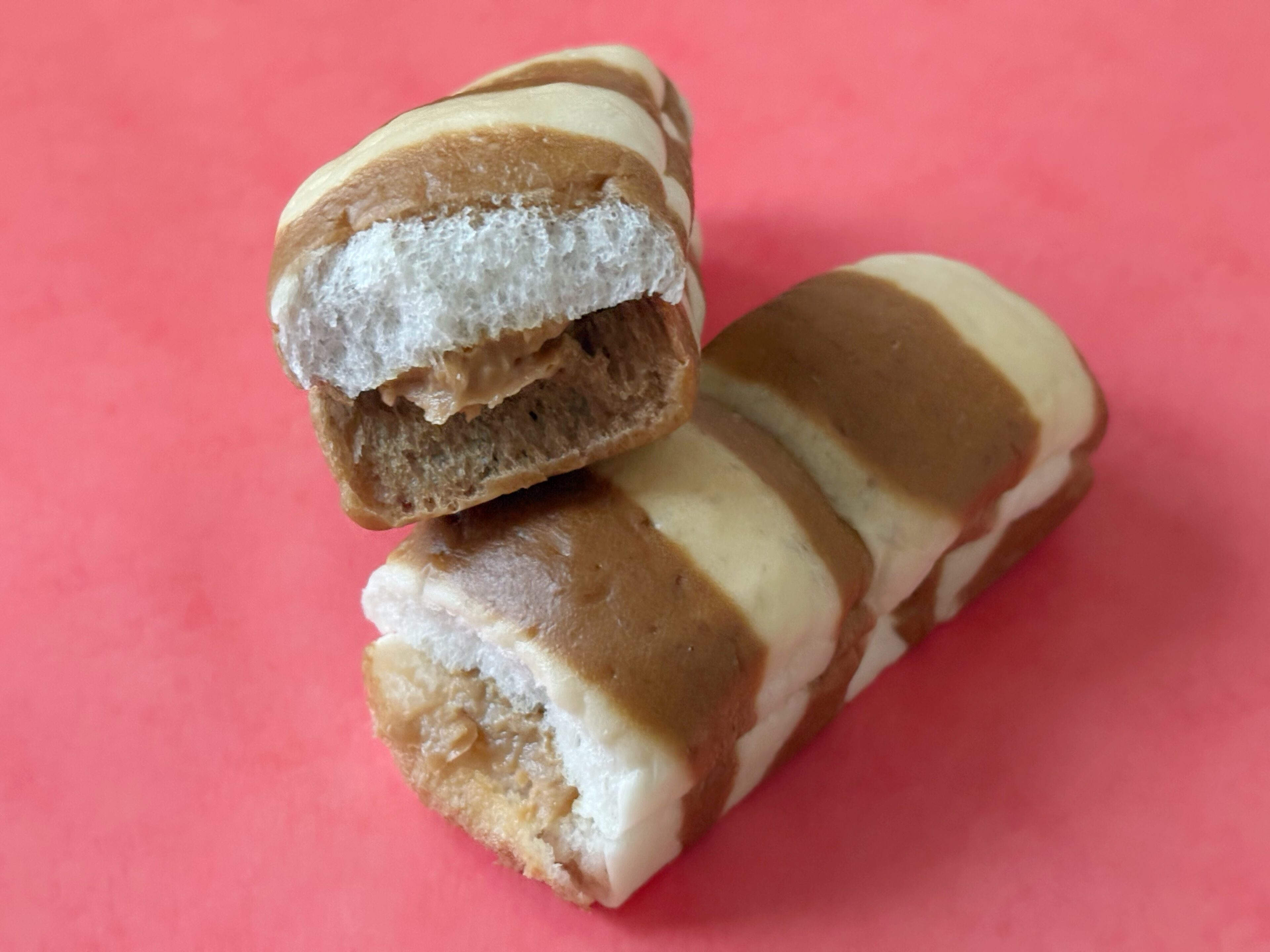 しましま模様のしっぽに見立てたミルク風味の生地とキャラメル風味のパン。ちぎりながら中のキャラメルクリームもいっしょにいただきます。