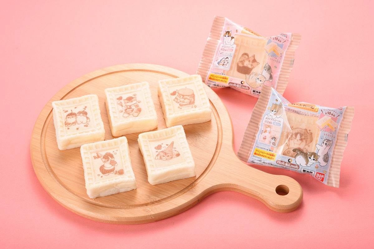もちもち生地の四角いワッフルの中にカスタード味のクリームを入れました。焼印は全10種類、オリジナルシールが1枚入(全12種類ランダム)です。12種類のうち1種類は、ファミリーマートオリジナル描き下ろしデザインなので、何が入っているのかお楽しみに。パッケージは「mofusand」とコラボレーションしたデザインで、全2種類です。