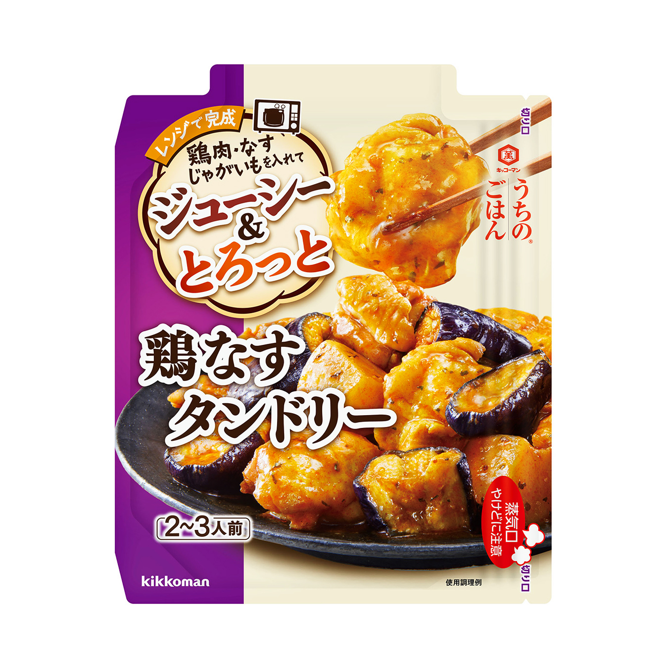 鶏もも肉、なす、じゃがいもをパウチに入れてチンするだけ。クミン、ターメリック、コリアンダーを使用したコクのある本格的な味わいです。