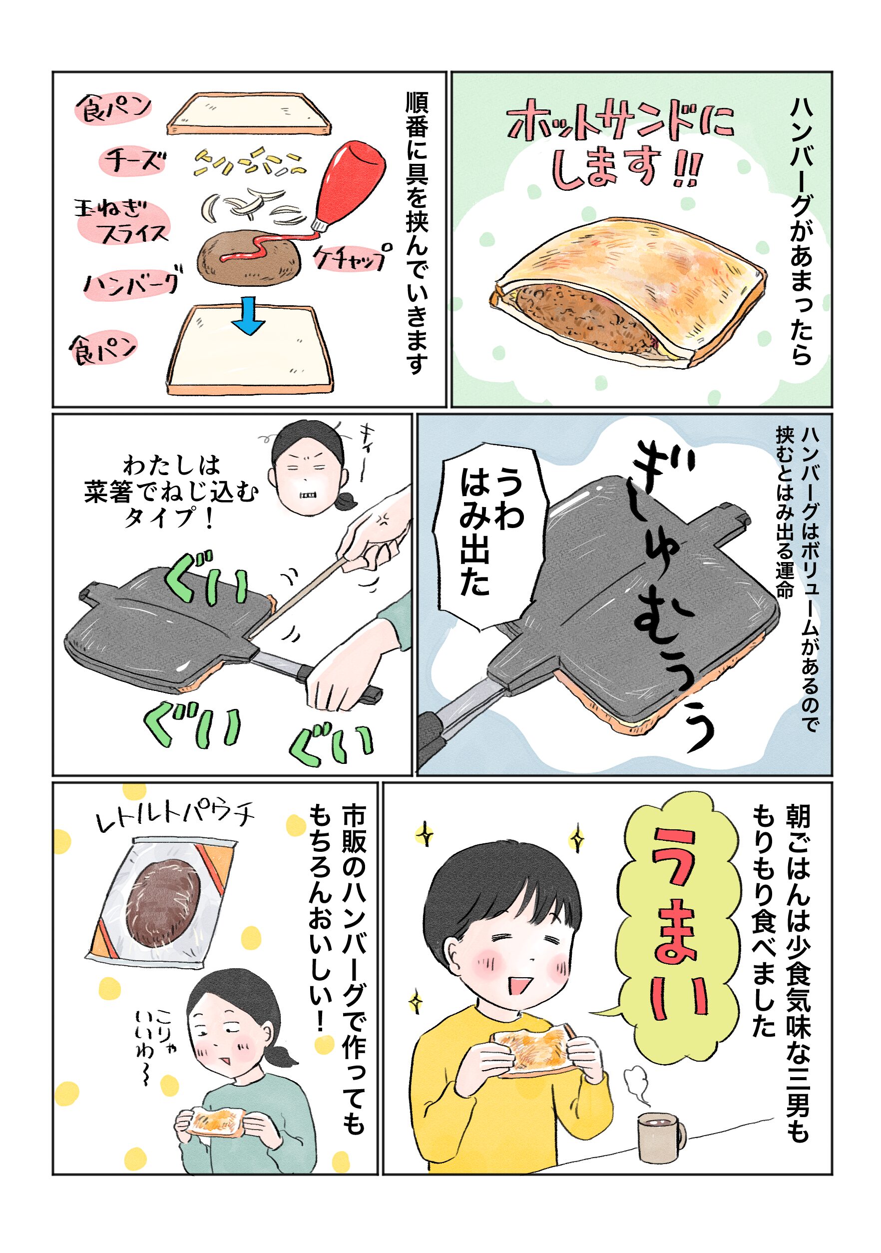 もちろん市販のレトルトハンバーグや冷凍ハンバーグを使っても◎ホットサンドは手軽でボリュームがあって温かくていいですよね~。今後もバリエーションを増やしていきたいです!
