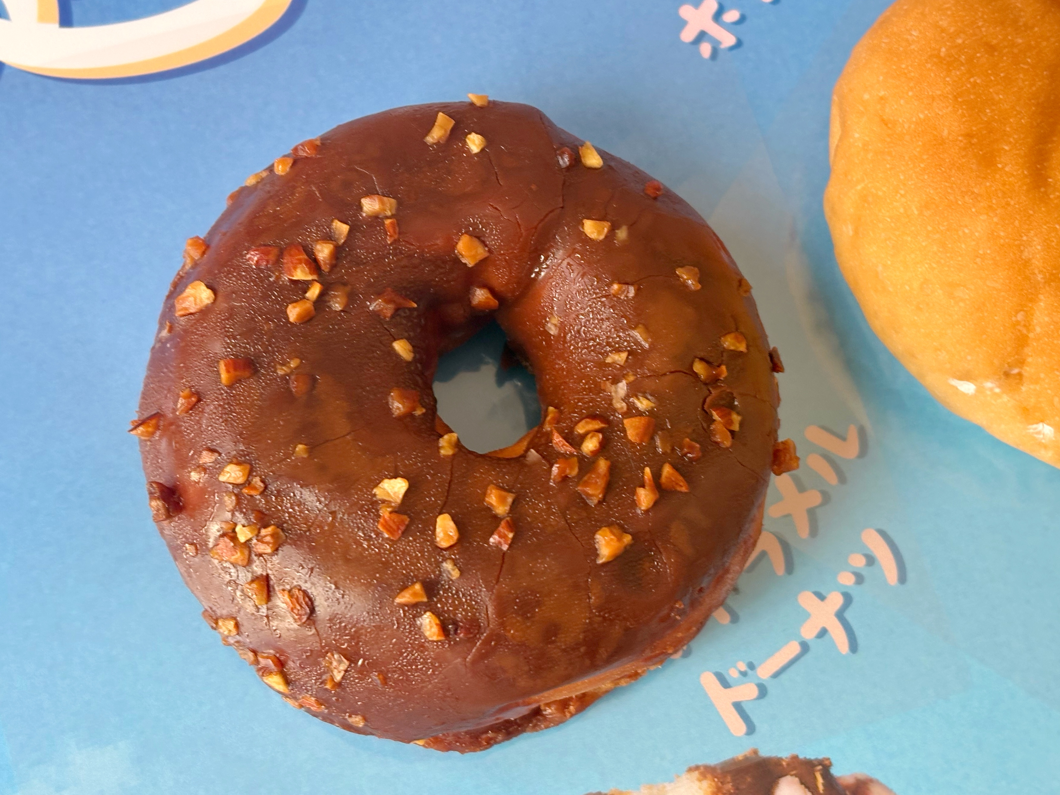 も~っちりとした食べ応えのあるドーナツ生地に、キャラメルクリームを絞ったドーナツ。表面にキャラメルチョココーティングとアーモンドをトッピングしました。