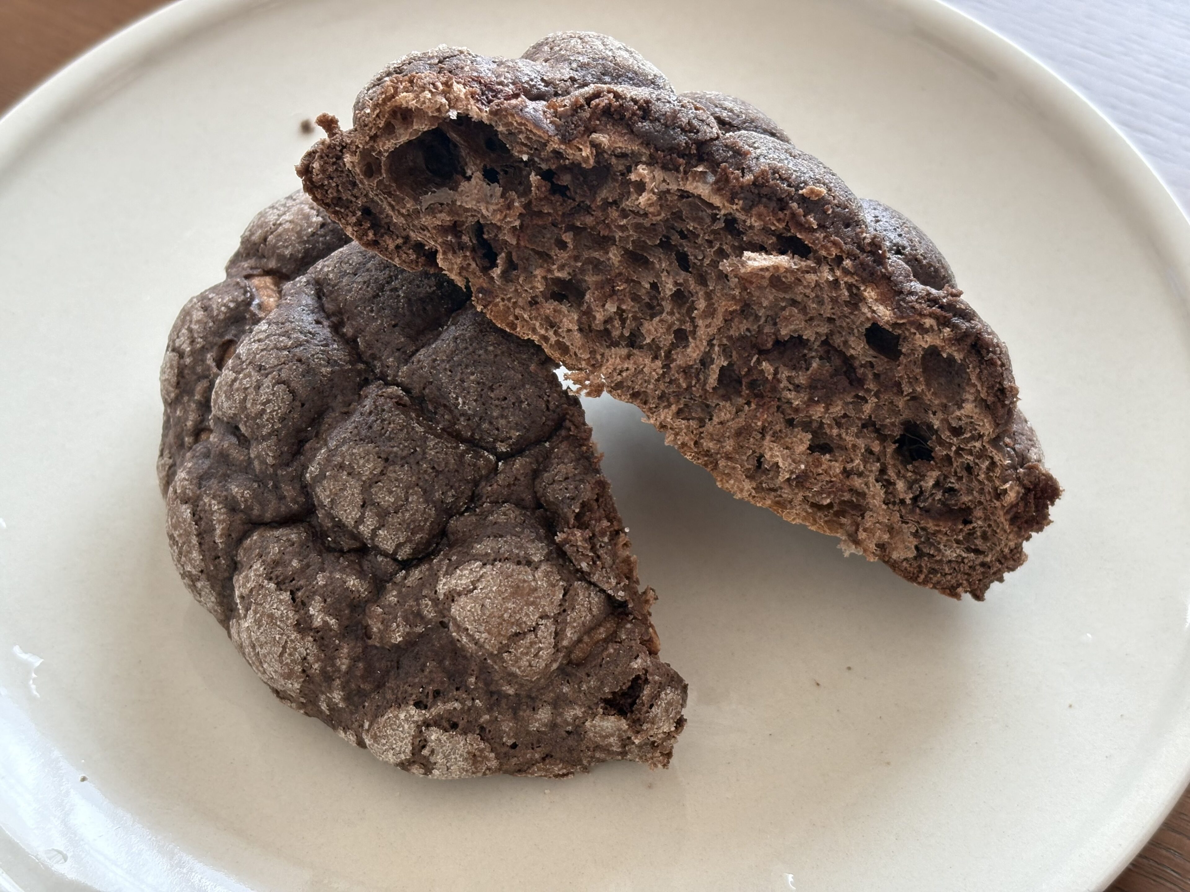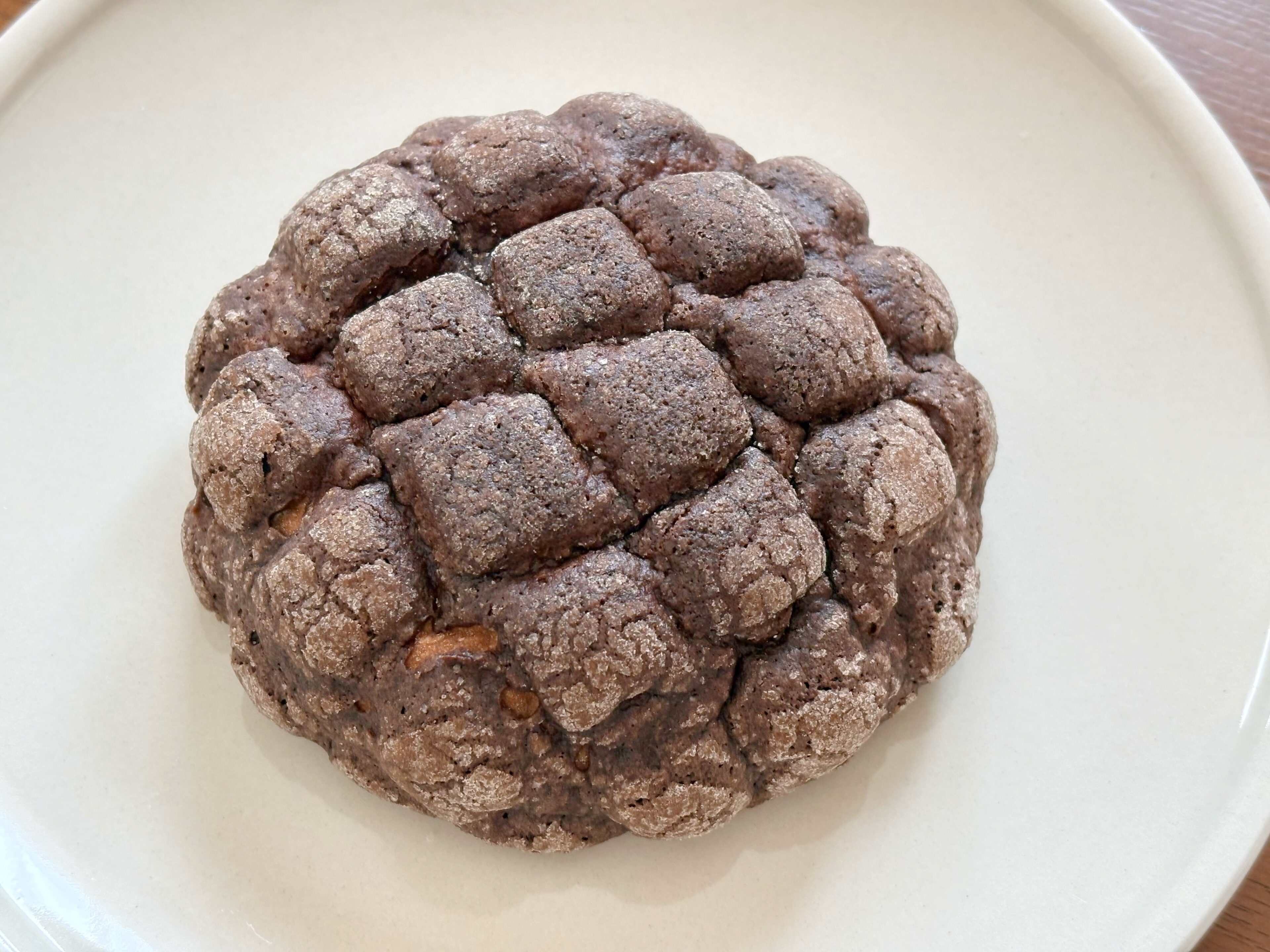 も~っちり食感のチョコチップ入りの生地に、チョコビスケット生地をかぶせたチョコメロンパン。サクッとしたビスケット生地と、中のもっちり食感のコントラストがクセになるおいしさです。