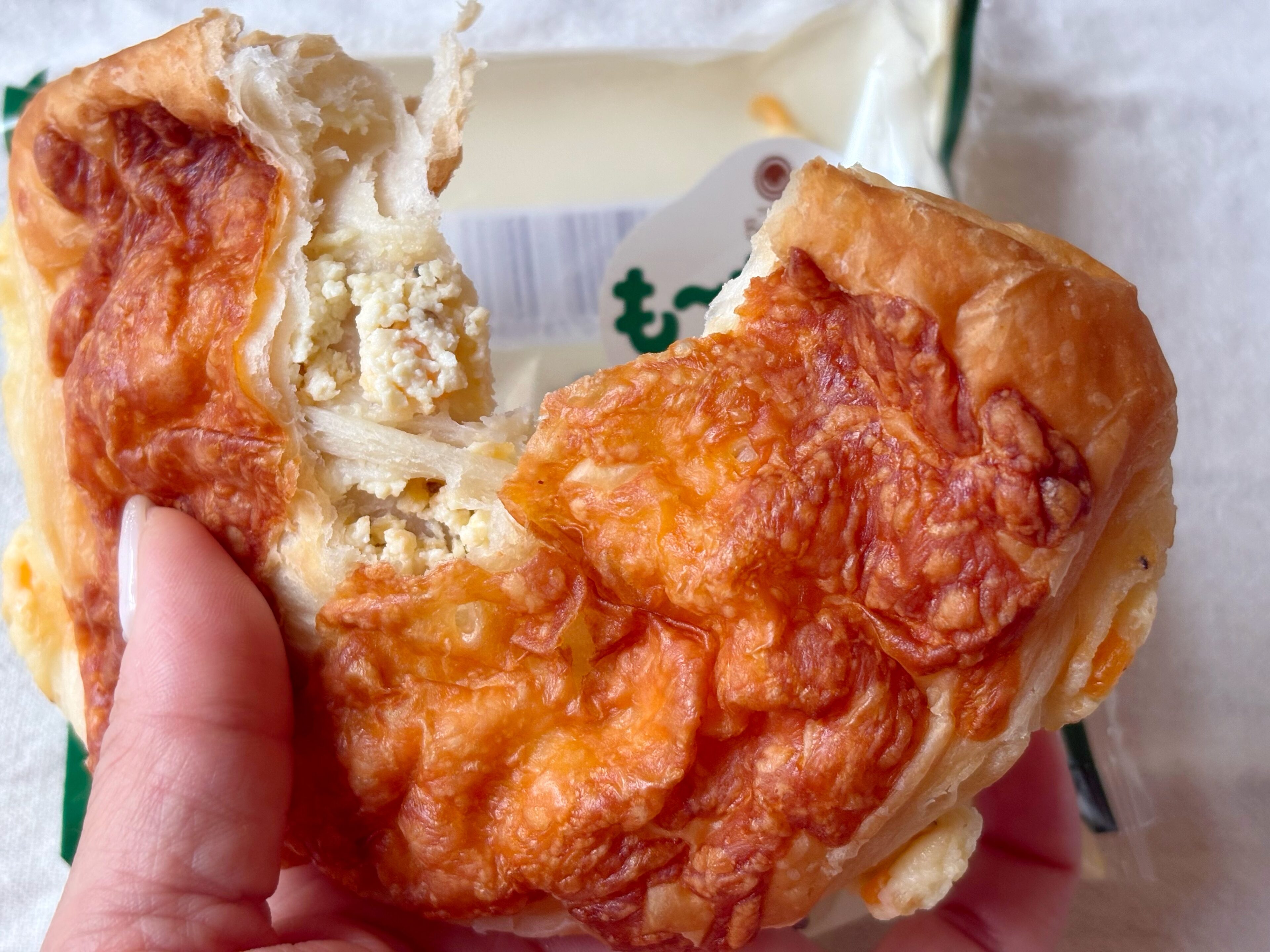 も~っちり食感の生地で、角切りチーズ入りのチーズクリームを包み、シュレッドチーズを追いトッピング。チーズ好きにはたまらない一品です。