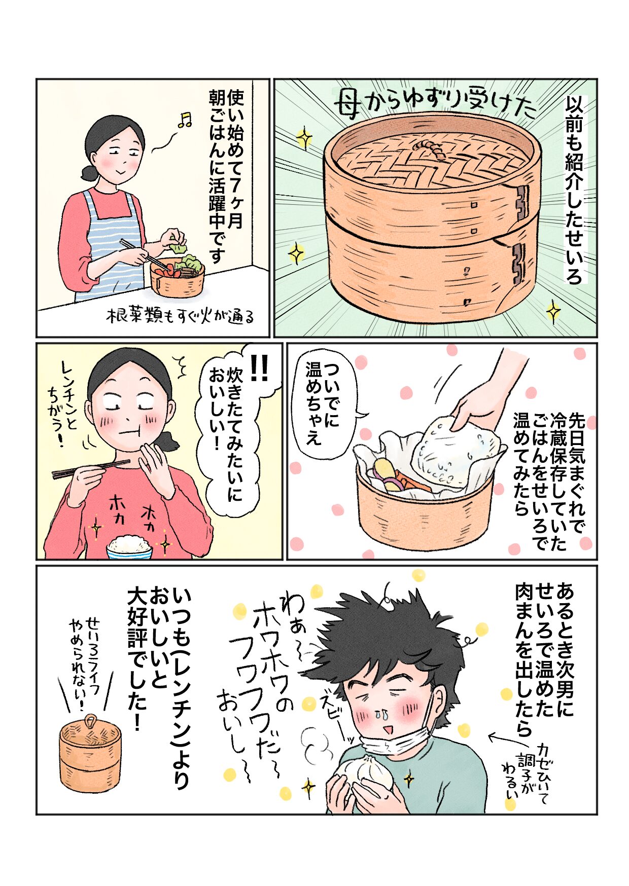 「せいろ」を使い始めて半年、今も大活躍しています。最近は主に朝ごはん用の野菜とささみ肉を蒸すのに使っているのですが(絶賛ダイエット中です)、先日ふとラップに包んで冷蔵していたごはんをせいろで温めてみたんです。そしたら炊きたてのごはんのように美味しい!レンチンごはんとは明らかに違いを感じるおいしさ!!