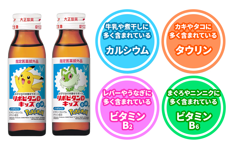 リポビタンDキッズは、子どもの発育に必要な栄養成分を配合したノンカフェインのミニドリンク剤です。1日1本、5才から飲むことができます。