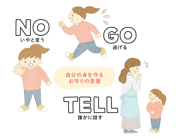 性被害やいじめを防ぐため、子どもには自分の身の安全を守る方法を伝えましょう。「いや! ダメ! やめて!」と拒否をする「NO」、その場から離れ、安全な場所に逃げる「GO」、相談しやすい大人に話す「TELL」の3つは、基本となる自己防衛のスキルです。けれど、中には「NO」と言えず、自分を責めてしまう子もいます。だからこそ、「GO」と「TELL」を特にしっかり伝えることが重要です。(水野さん)