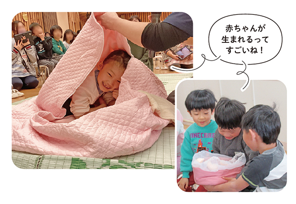 5年前、子どもたちの「のぞきっこ」をきっかけに、全園児にはプール前に絵本『だいじだいじどーこだ?』(大泉書店)や水着のイラストを使い、「プライベートゾーン」のお話を始めました。また、年長児には冬に小学校入学準備として、法人全体で「いのちの授業」を実施。胎児人形や疑似産道を通して、子どもが見て触れて、楽しく学べるように工夫しています。子どもに対しては、恥ずかしいことではなく大切なこととして、真剣な表情で、分かりやすい言葉で伝えることを心掛けています。