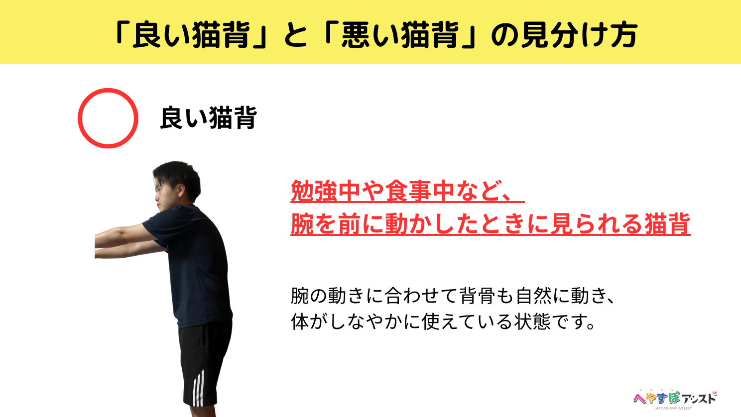 親御さんからよく聞く姿勢の悩みとして「うちの子すごく猫背なんです…」という声があります。まず知っておきたいのは、「猫背=全部ダメ」ではないということです。私たちの体は、腕を前に伸ばすと自然に背中が少し丸くなり、腕を後ろに引くと背中が反るような構造になっています。