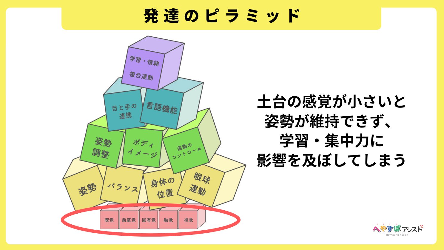 姿勢が崩れるとき、表面上は「猫背になる」「ぐにゃっと傾く」といった姿が目につきます。しかし実は、その背景には、感覚や身体の土台(=発達ピラミッドの下層)が十分に育ちきっていないケースが多くあります。発達のピラミッドでは、下の土台(感覚・身体機能)が安定して、はじめて学習や集中といった上の力が発揮できると考えられています。