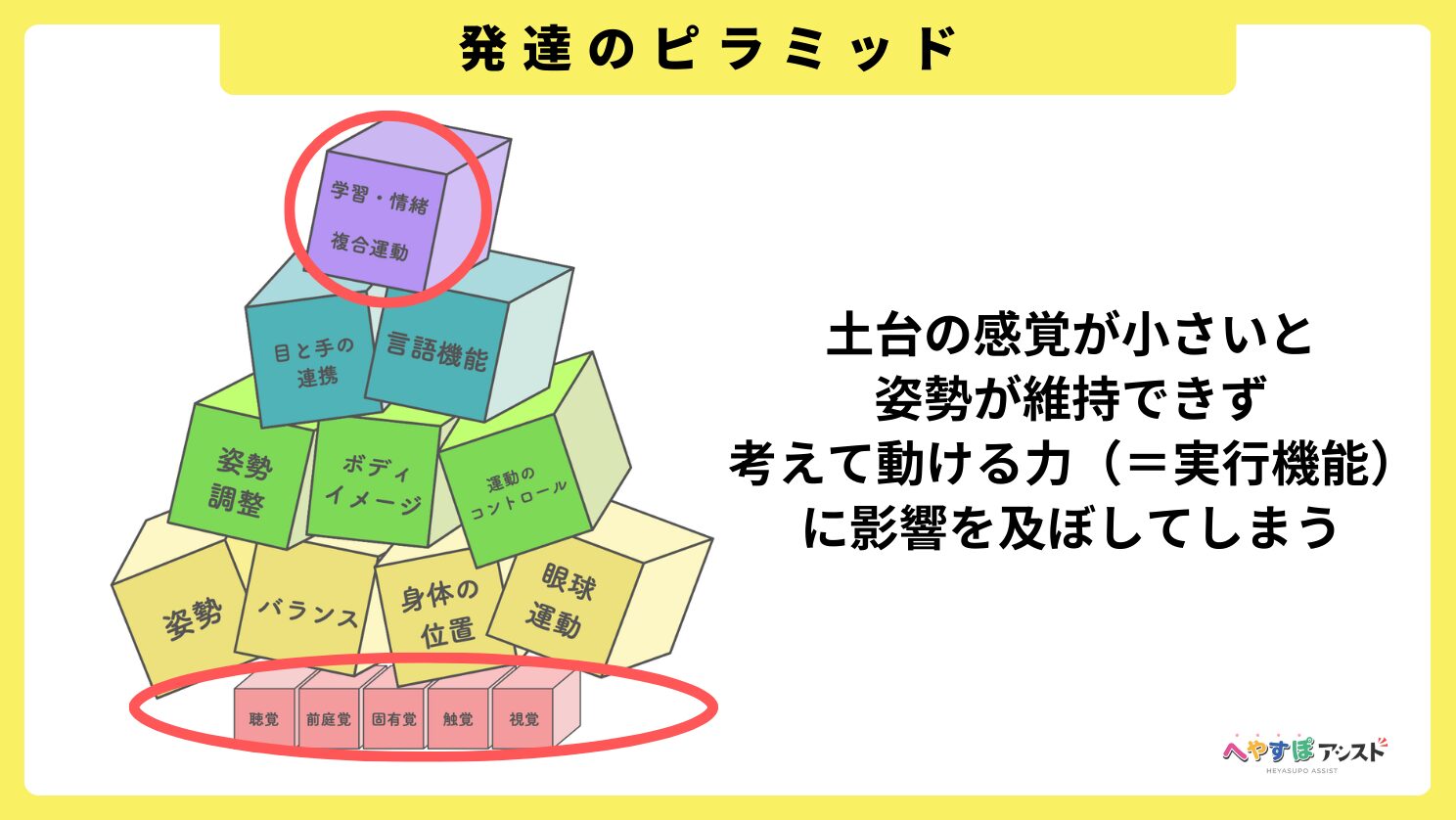 子どもの発達を考えるときに、よく用いられる考え方に「発達のピラミッド」があります。これは、発達が下から順番に積み上がっていくというモデルです。