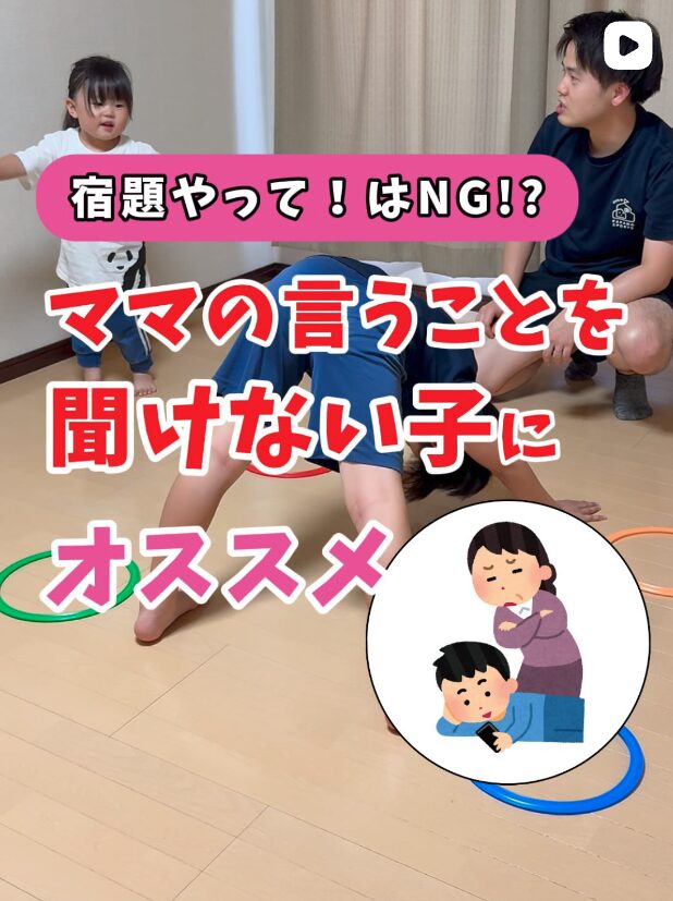 手足・体幹に刺激を入れることで姿勢を維持する練習に加え、更に親御さんの指示に耳を傾け、フープの色も目で確認しながら行うので、視覚・聴覚の情報処理の練習になります。