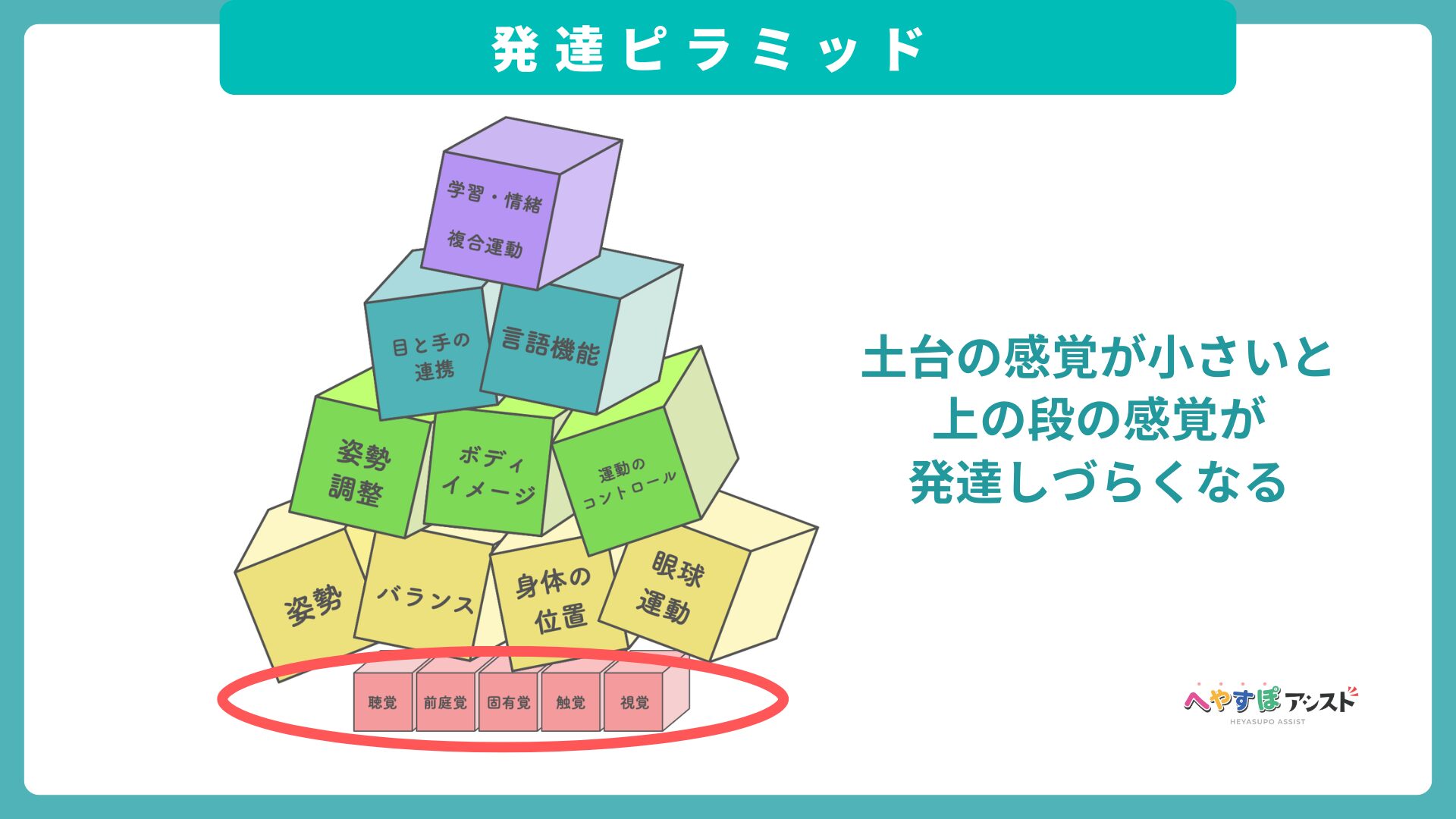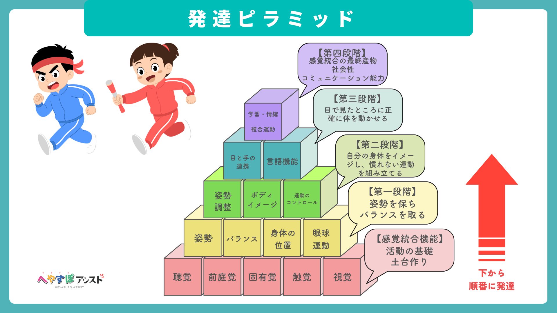 これは、発達を「土台の部分から積み上げていく」という考え方ともつながります。姿勢や集中、器用さといった目に見える力は、感覚などの発達の土台の影響を受けます。これまでご紹介してきた「発達のピラミッド」でも、感覚や身体機能が土台になり、その上に姿勢や協調運動、さらに注意や学習が積み上がる形で整理されています。