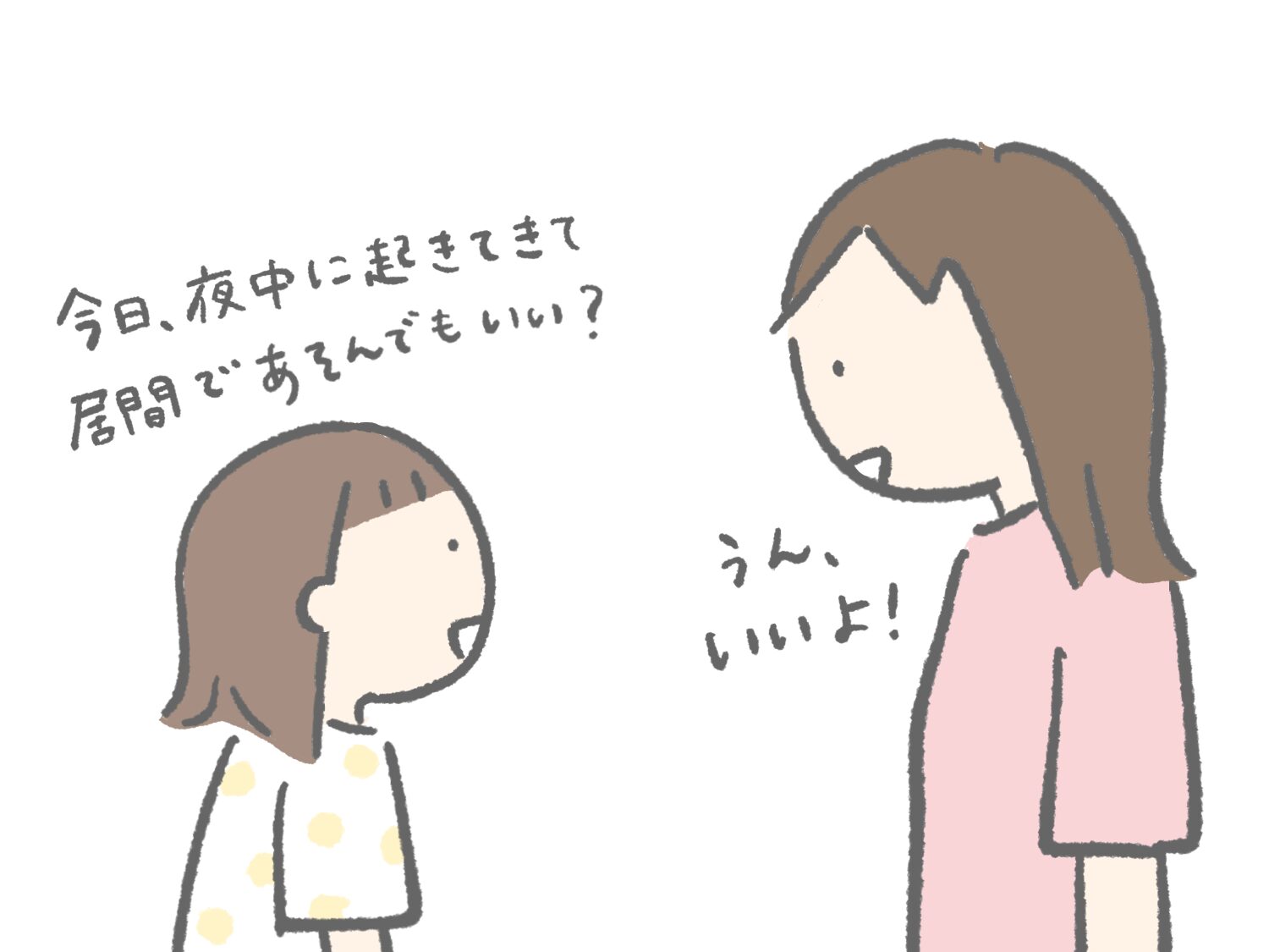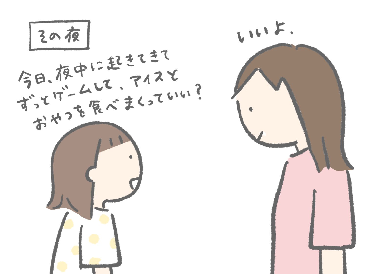寝る前に「夜中に起きてきて居間で遊んでもいい?」と聞いてくる6歳。最近なんて「夜中にこっそり起きてゲームしてアイスとおやつを食べまくってもいい?」とだんだんグレードアップしてきています。なんと聞かれても「いいよ、オッケー!」と答える私。