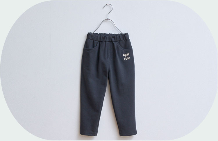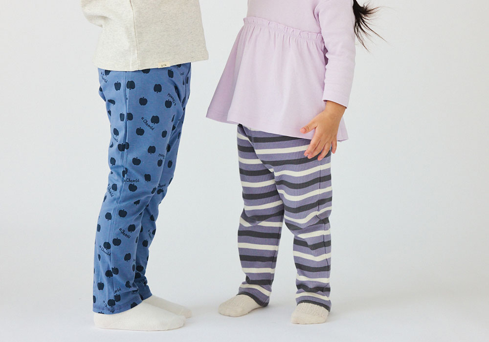 前後どちらでも履けるデザインで、子どもが自分でさっと着脱できるのがうれしいポイント。無地は着回しやすく、総柄はおしゃれな印象に仕上がります。カラーによって素材は異なりますが、伸縮性のある綿混ベア天竺やリブ素材で動きやすく、どれも毎日の通園着や普段着として活躍してくれます。