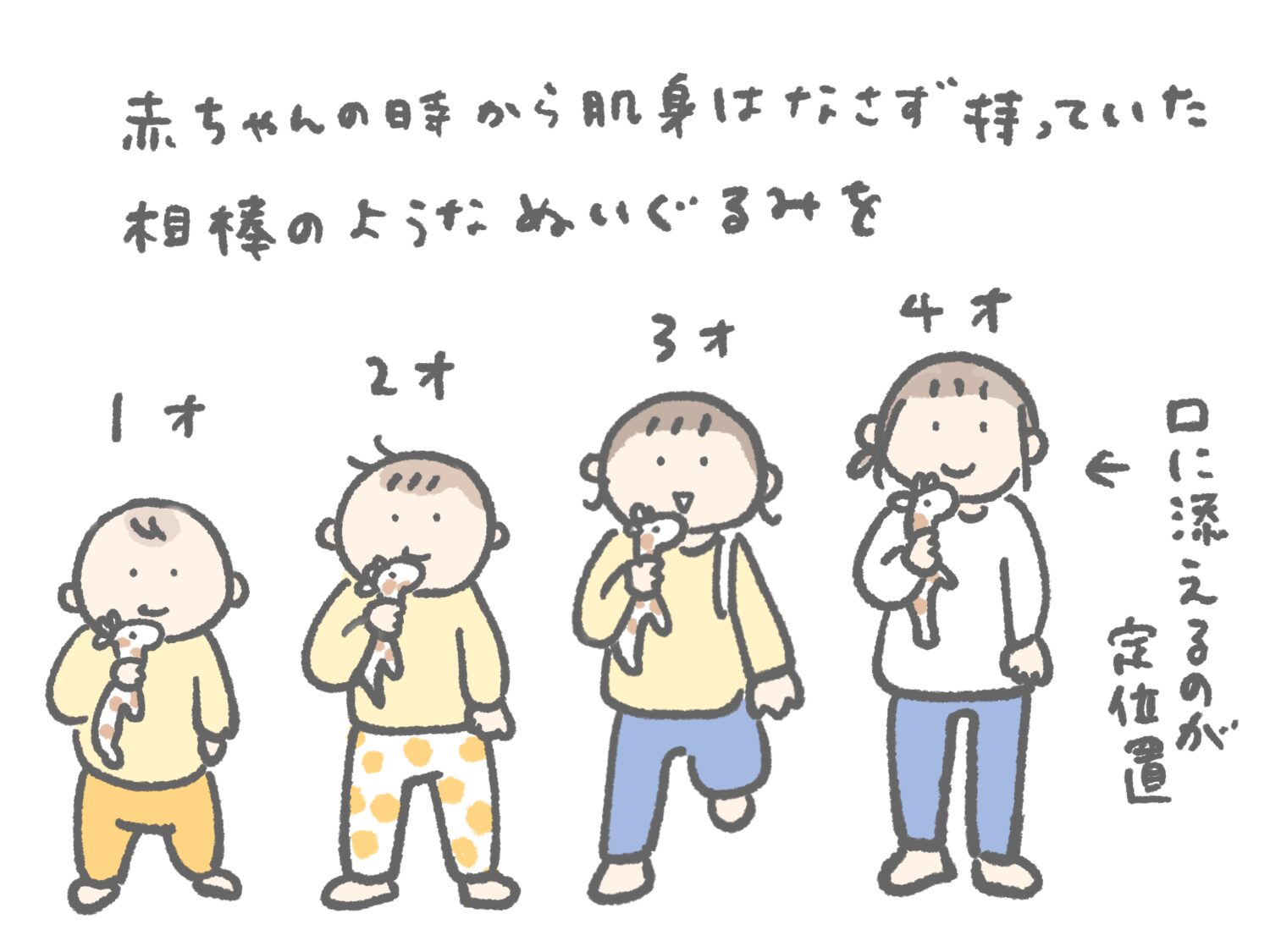 赤ちゃんの頃から、肌身離さず持っていたキリンのぬいぐるみがいました。お出かけする時も寝る時もどんな時も一緒で、家に忘れて出かけてしまった時などは取りに戻らないといけないくらい、相棒のような存在でした。