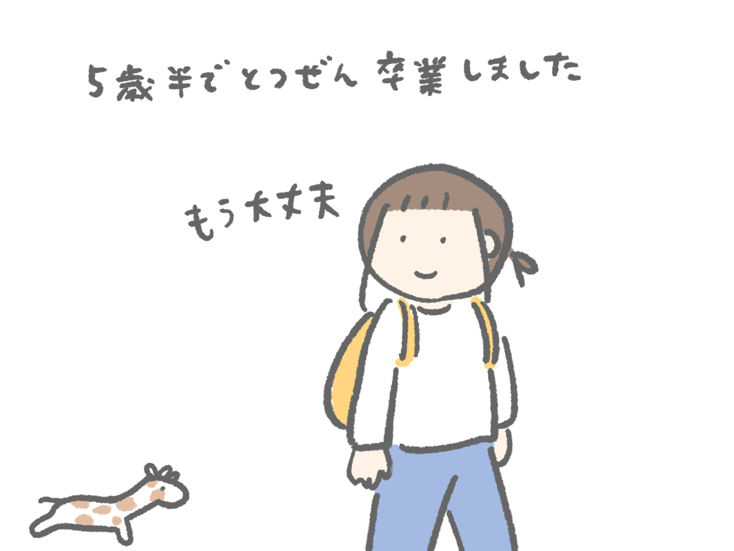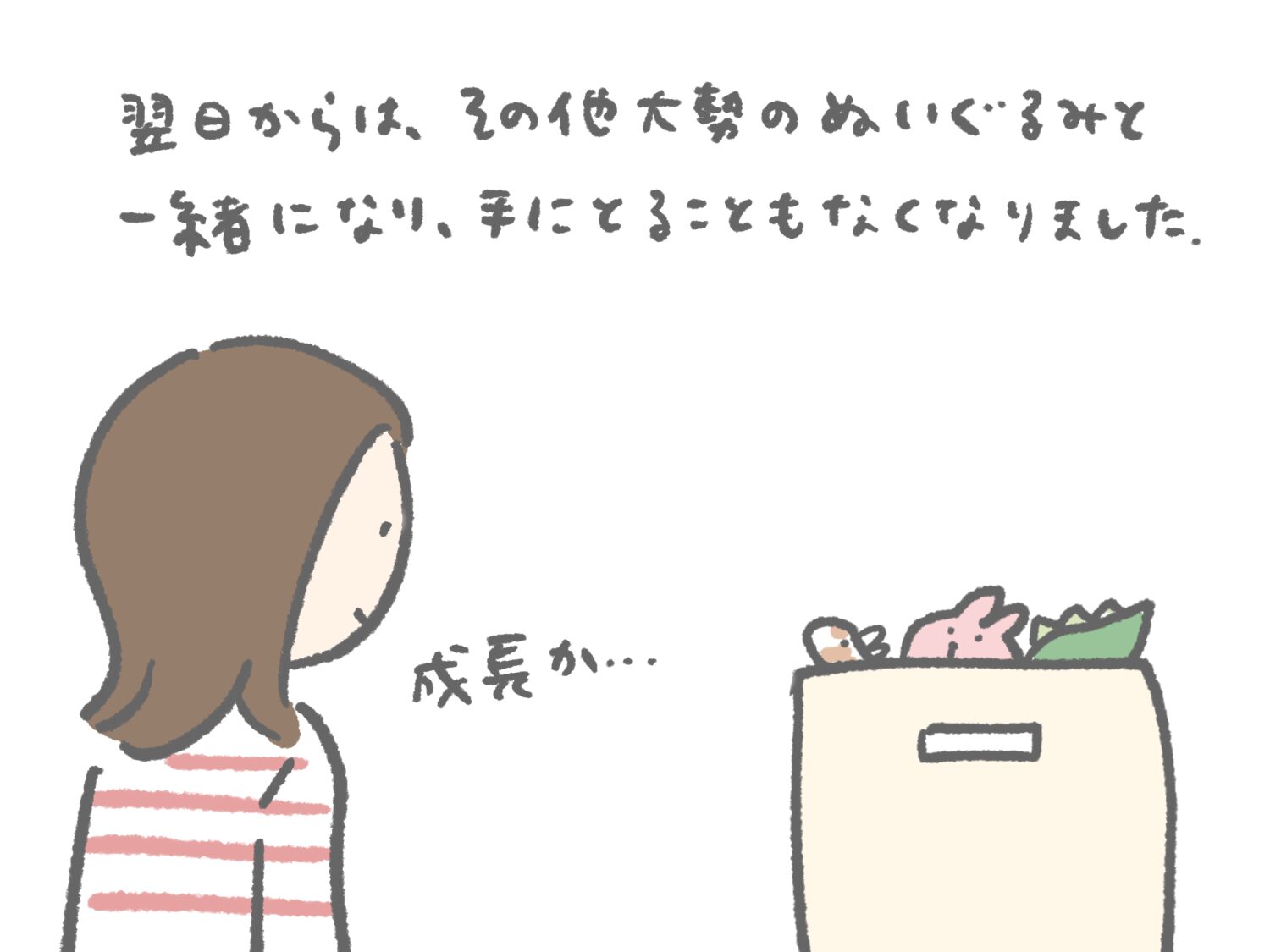 5歳を過ぎてもその様子だったので、これは小学校に入学してもずっと続くんじゃないかと思っていたのですが、いきなり卒業の日が訪れました。寝る時に「もう大丈夫」と言って相棒を居間に置いたまま布団に入り、次の日から出かける時にも連れて行かなくなりました。相棒はその他大勢のぬいぐるみと一緒にボックスに収納されてしまい、「成長だな・・」と感じると同時に、小さな頃の様子が思い出されてちょっぴり切なくなりました。