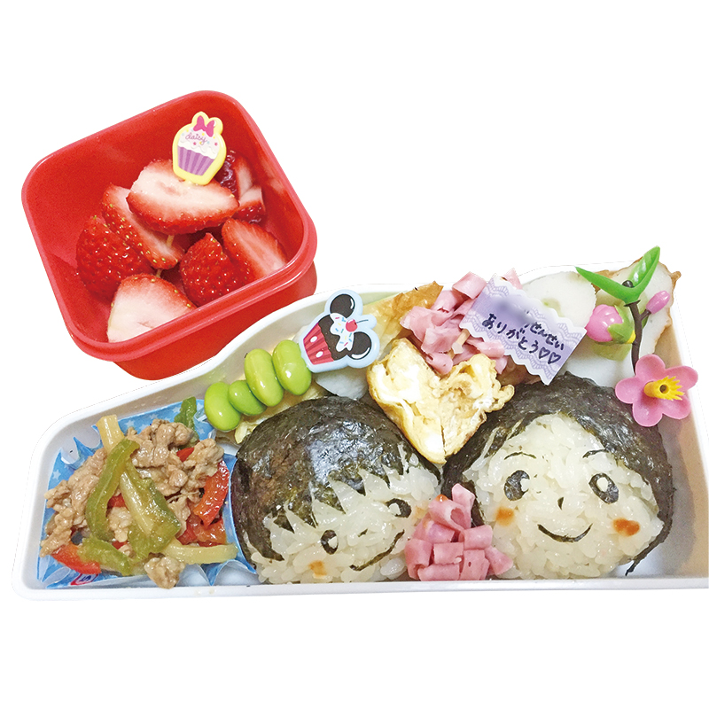 年長最後のお弁当は、先生のお顔のおにぎりと、「先生ありがとう」のピックでキャラ弁に。ハムでお花を作ったり、卵焼きをハートにしたり…。気持ちが伝わるように作りました。子どもが先生に見せると、涙を浮かべて喜んでくれたそう。写真を撮り、ピックは持ち帰ってくれました。(riechelさん)