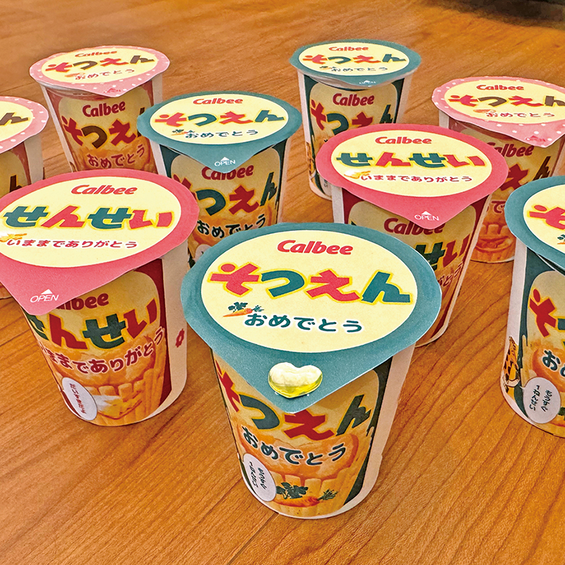 紙コップに個包装のお菓子を3、4個入れて、「せんせいありがとう」のメッセージが入った蓋をし、オリジナルパッケージのプレゼントを作りました。手作りと分かると、「すごーい」「かわいい」と良い反応をもらえました。(はろせさん)