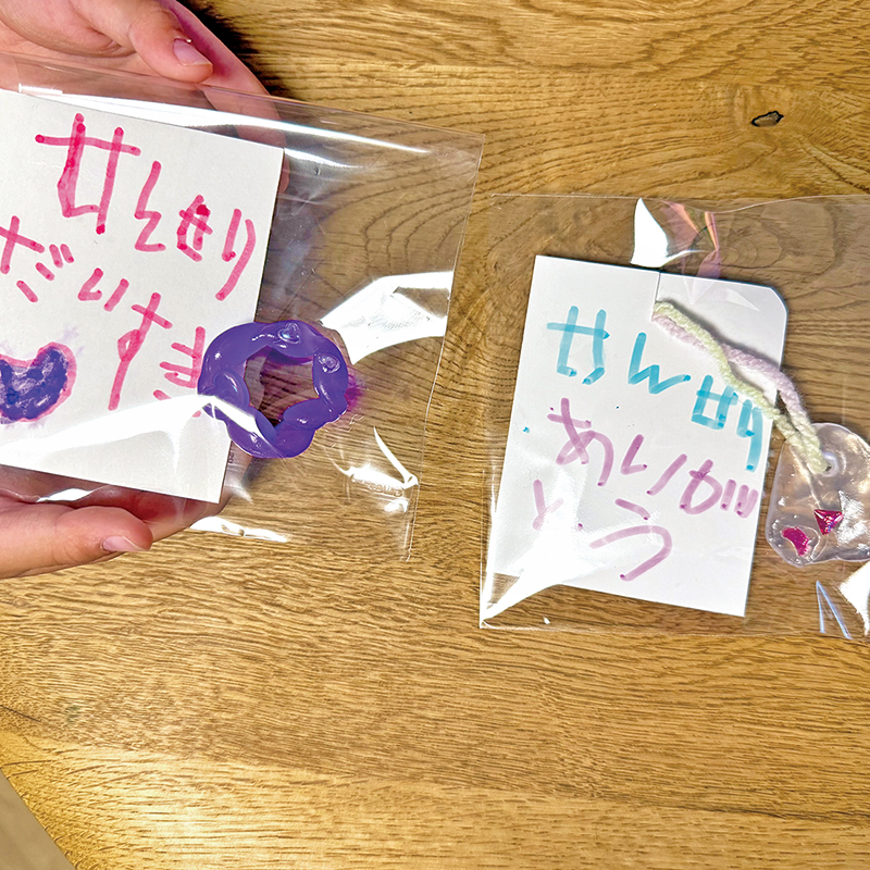 お湯で柔らかくなるプラスチック粘土で、指輪やチャームを作りました。透明感を生かして中にシールを入れるなど工夫も。失敗してもお湯で温めればやり直せるので、息子も納得がいくまで没頭していました。台紙にメッセージを書いて、シンプルながら気持ちの込もったプレゼントになりました。(はっぴさん)