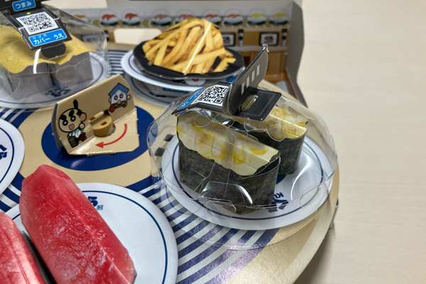 この二次元コードタグで商品が流れている時間を管理しているほか、各店舗ごとに、今どの種類のお寿司が何皿流れているかという情報を収集できるんです。今回は二つの二次元コードを作ってもらって、一つはホームページに、もう一つはくら寿司の公式社員YouTuber・イナバさんのYouTubeに飛ぶようになっています。