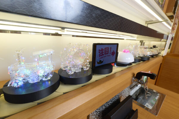 岡本さん 今は約70店舗に導入しているんですが、注文していただくと、下の回転レーンからパレードのような音楽と共にキラキラの装飾が流れてくる仕組みになっています。「おめでとう」と「ありがとう」の2つのメッセージを選択でき、サプライズでお祝いや日頃の感謝を伝えられるサービスです。